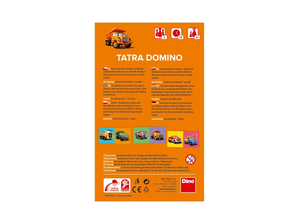 Kdo by neznal české automobily Tatra. Tradiční hra seznámí děti s různými vozidly této české značky. Při hraní budou párovat obrázky tatrovek a procvičí si pozornost a logické myšlení. Díky použití kartonu místo obvyklého dřeva je domino lehoučké a děti si ho mohou vzít s sebou i na cesty. Domino bylo vyrobeno v ČR z kvalitního zdravotně nezávadného kartonu, který je zcela neškodný i v případě požití.