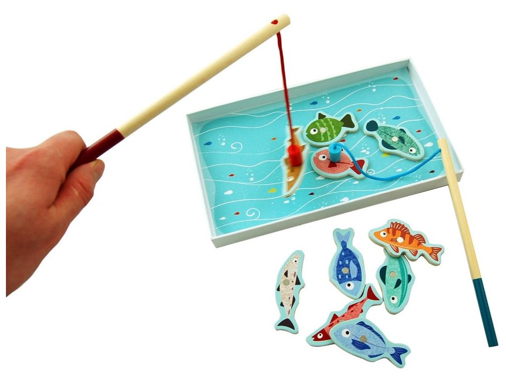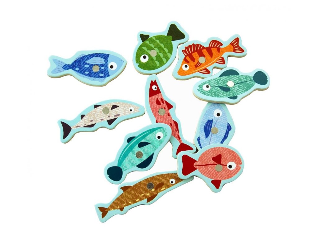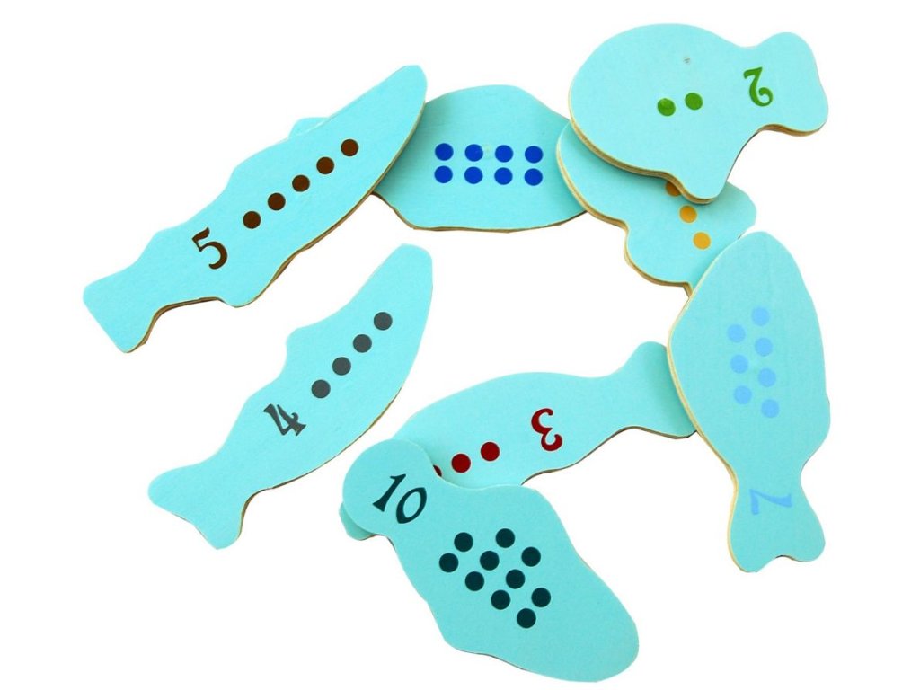 - 10 ks dřevěných barevných rybiček (každá rybička je označena z druhé strany počtem bodů),