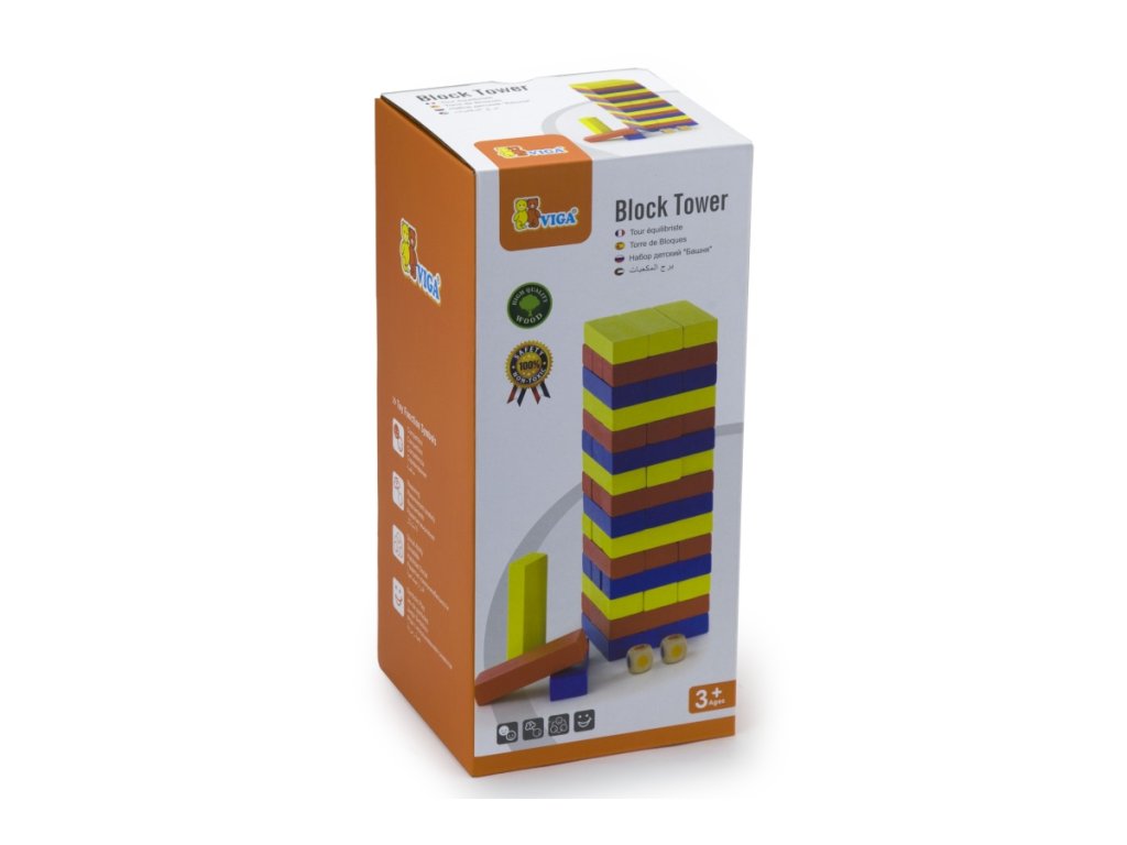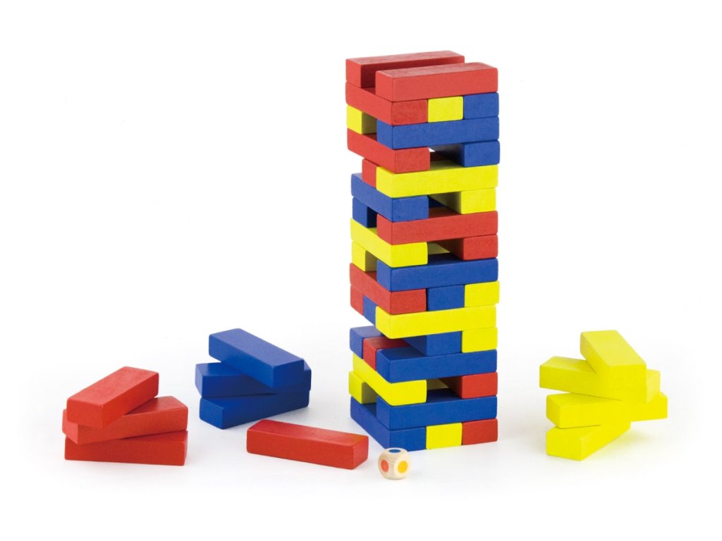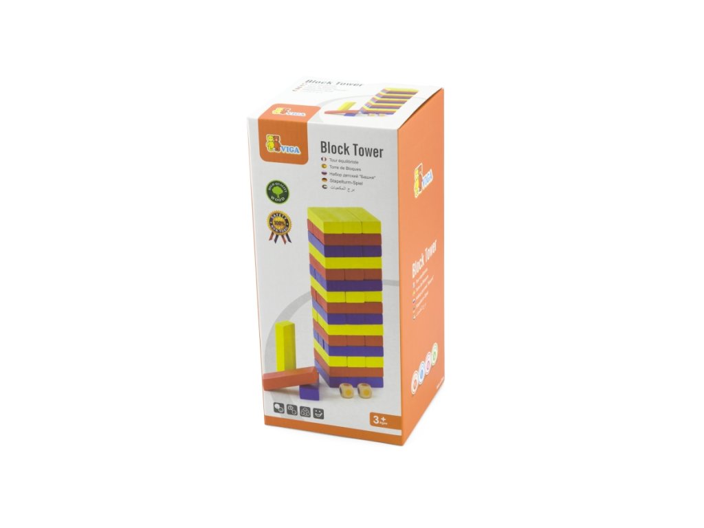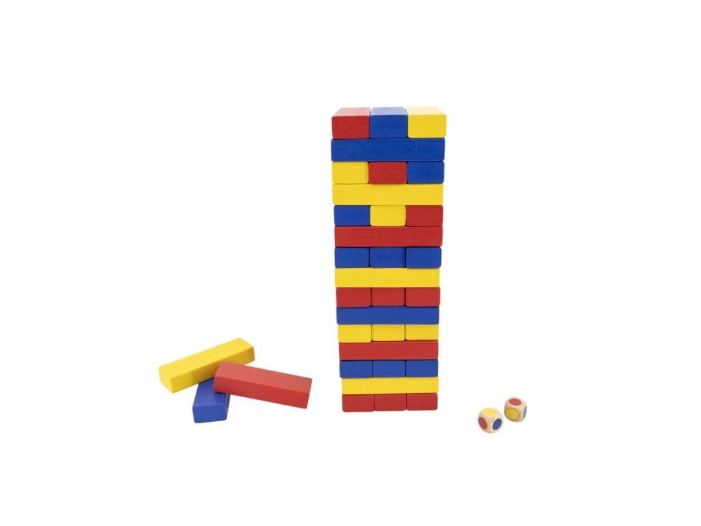 Dřevěná jenga věž barevná. Obsahuje 48 kostek Jengy a 2 hrací kostky.Rozměry balení cca 26,5 x 12 x 12 cm. Věk 3+Doplňkové parametry