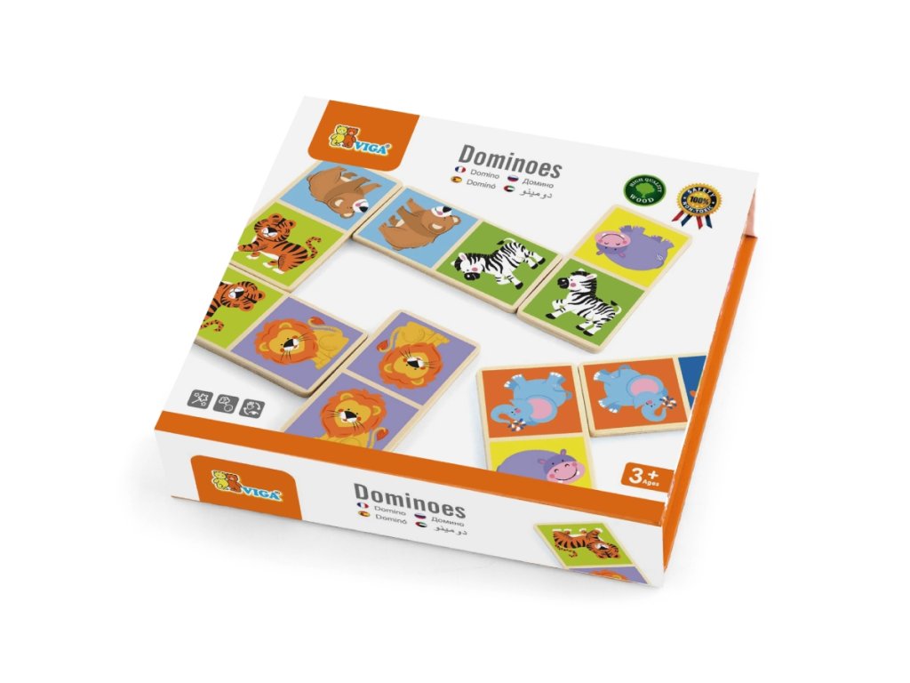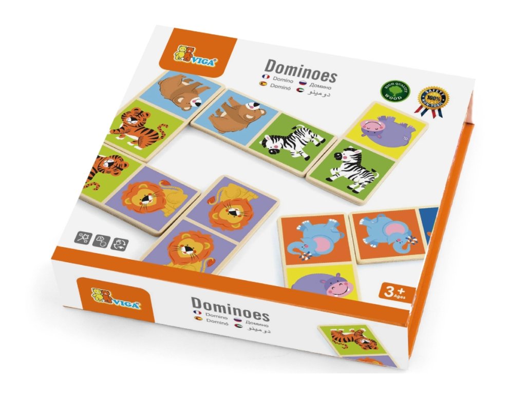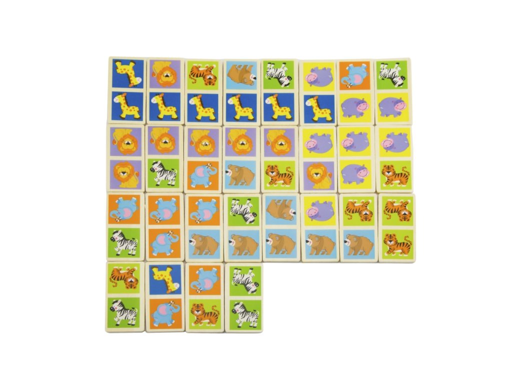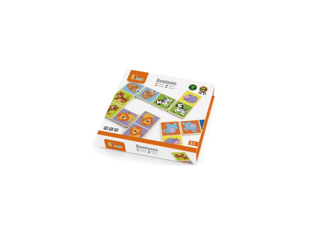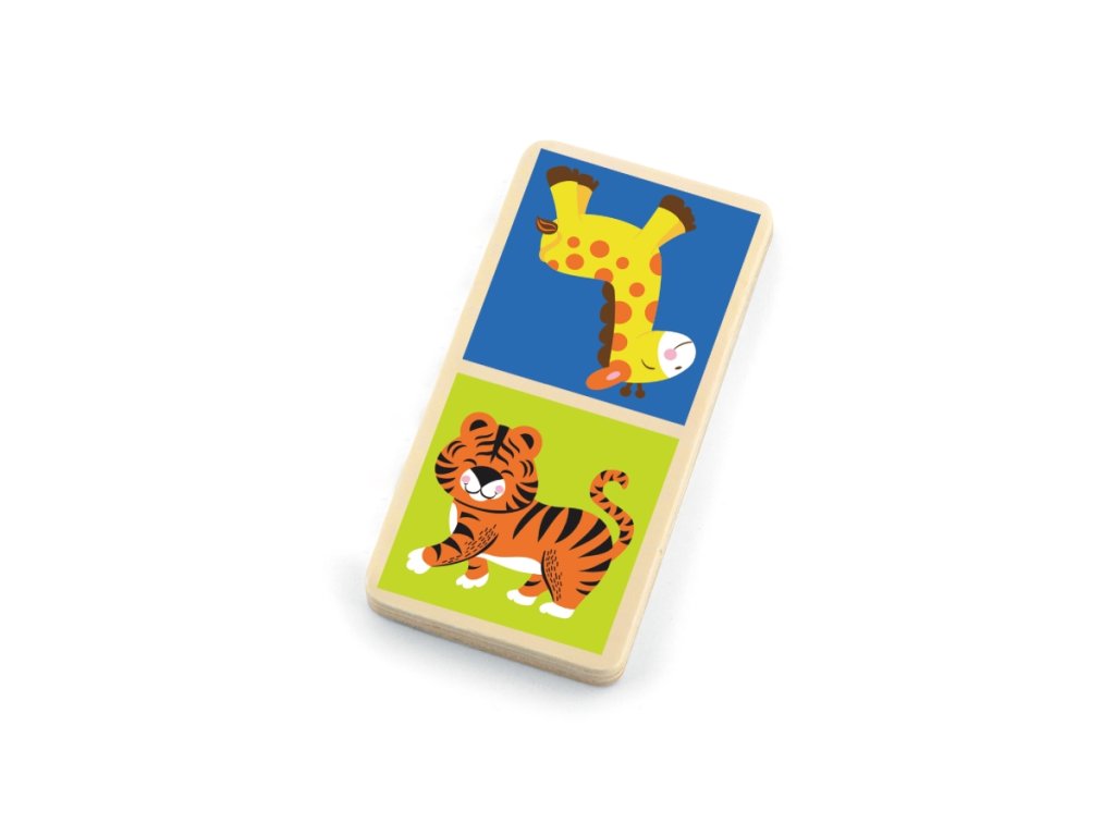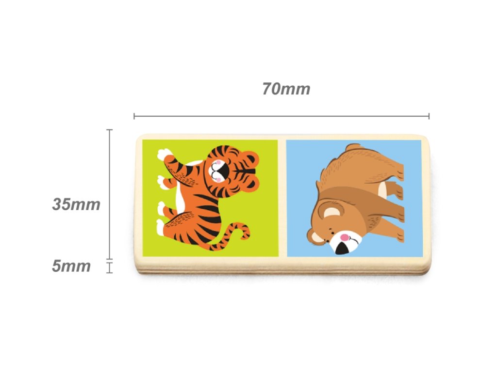 Dřevěné domino s divokými zvířátky. Rozměr jednoho dílku cca 7 x 3,5 x 0,5 cm. Baleno v krabičce, která slouží jako úschovný box pro domino. Rozměry balení cca 21 x 19 x 4,5 cm. Věk 3+Doplňkové parametry