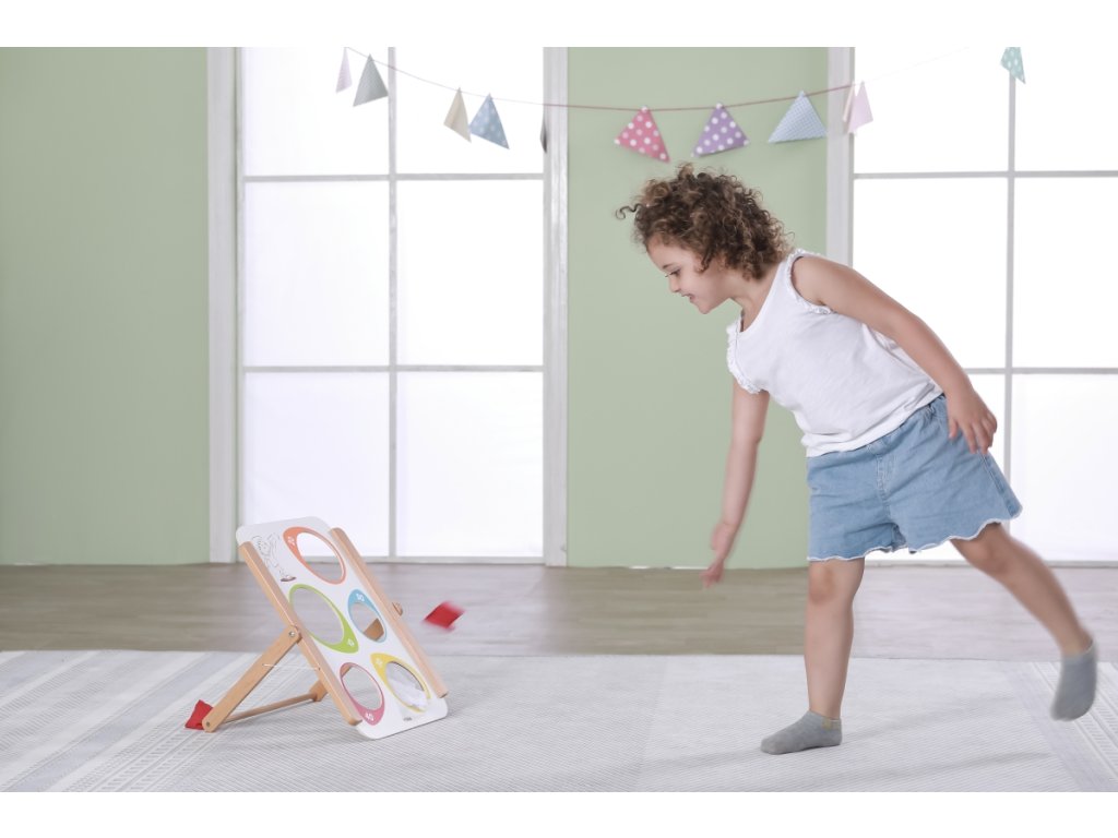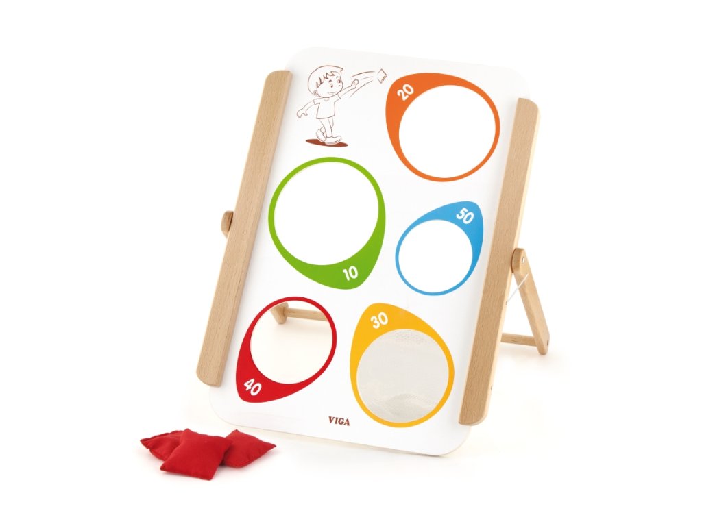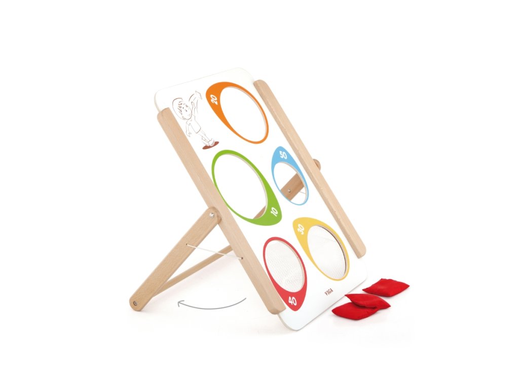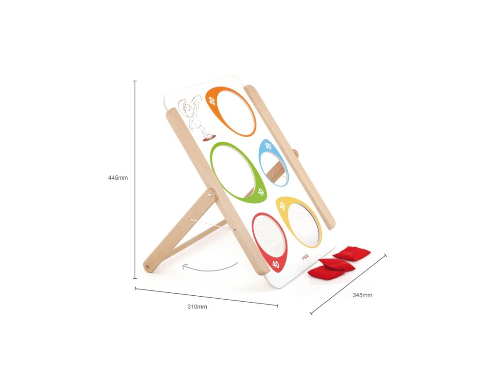 Hra házení pytlíků s pískem do otvorů, za každý otvor je určitý počet bodů. Rozměry hračky cca 35 x 46 cm. Rozměry balení cca 36 x 49 x 3,5 cm. Věk 2+Doplňkové parametry