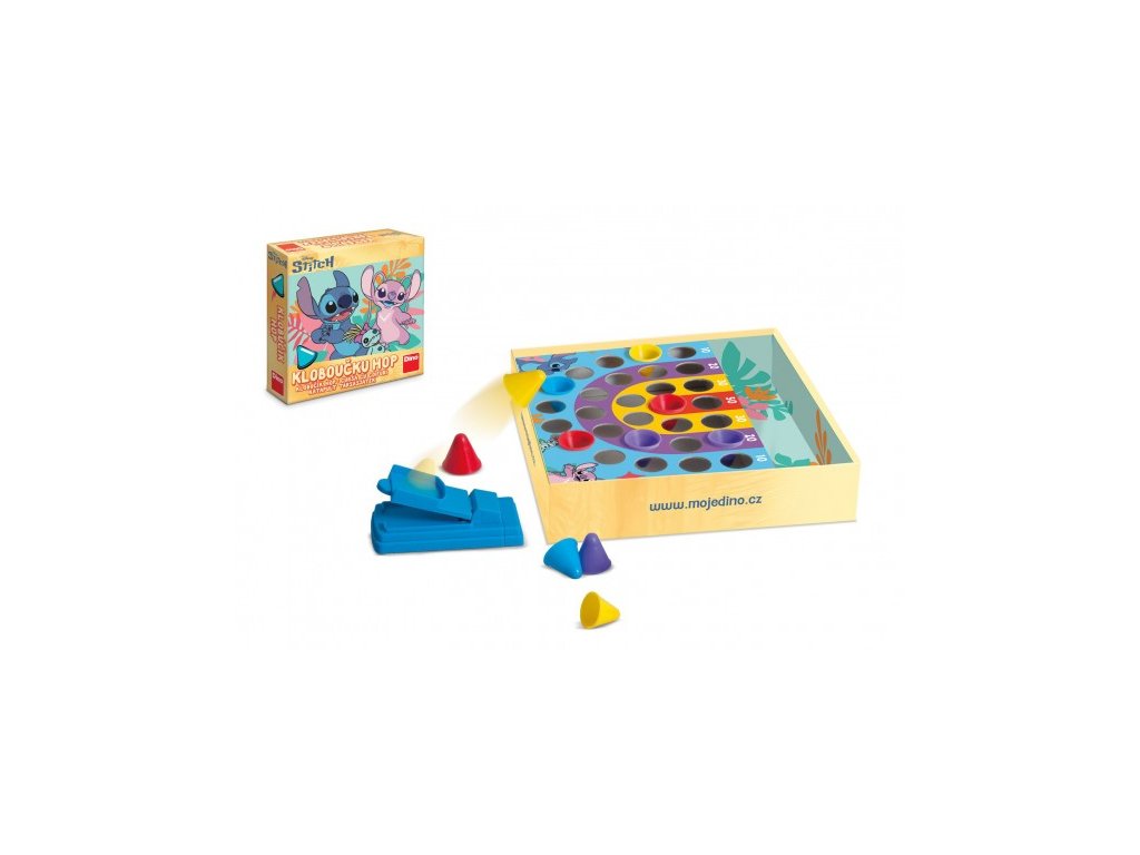 Kloboučku HOP! Oblíbená retro hra v novém designu populární licence Stitch. Lítejte vesmírem s nezbedným bláznivým Stitchem a jeho kamarádkou Angel a u toho potrénujte dobrou mušku, zručnost, motoriku i počítání. Každý klobouček v terči se počítá, a když se vám podaří umístit barvu kloboučku do stejné barvy v terči, máte dvojnásobek bodů. Díky stabilní odpalovací rampě zvládnou děti již od 4 let. Kdo trefí všechny kloboučky do terče? Zahrajte si sami, nebo poměřte své dovednosti s kamarády. Věk 4+