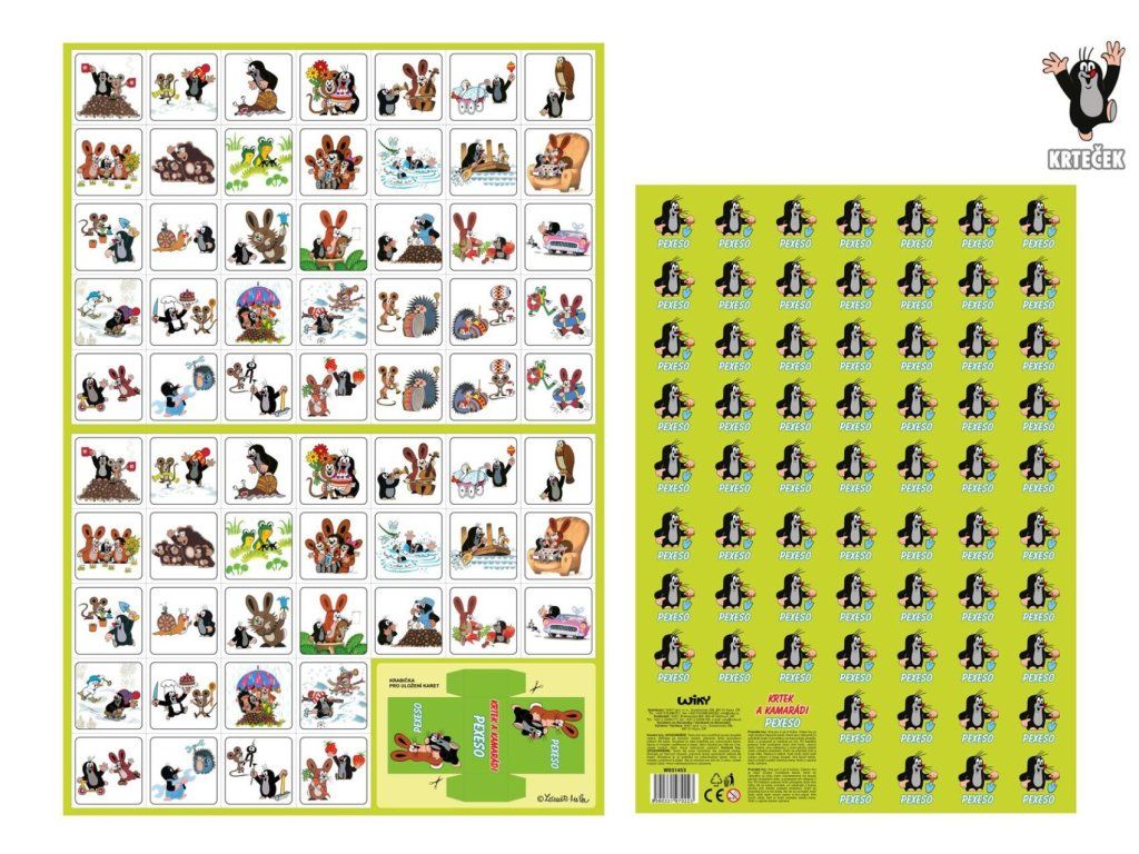Krtek Pexeso vystřihovací, Krtek a kamarádi. 32 párů. Na archu krabička k vystřižení. Rozměry jednotlivých kartiček 48x48 mm. Papír 400gDoplňkové parametry