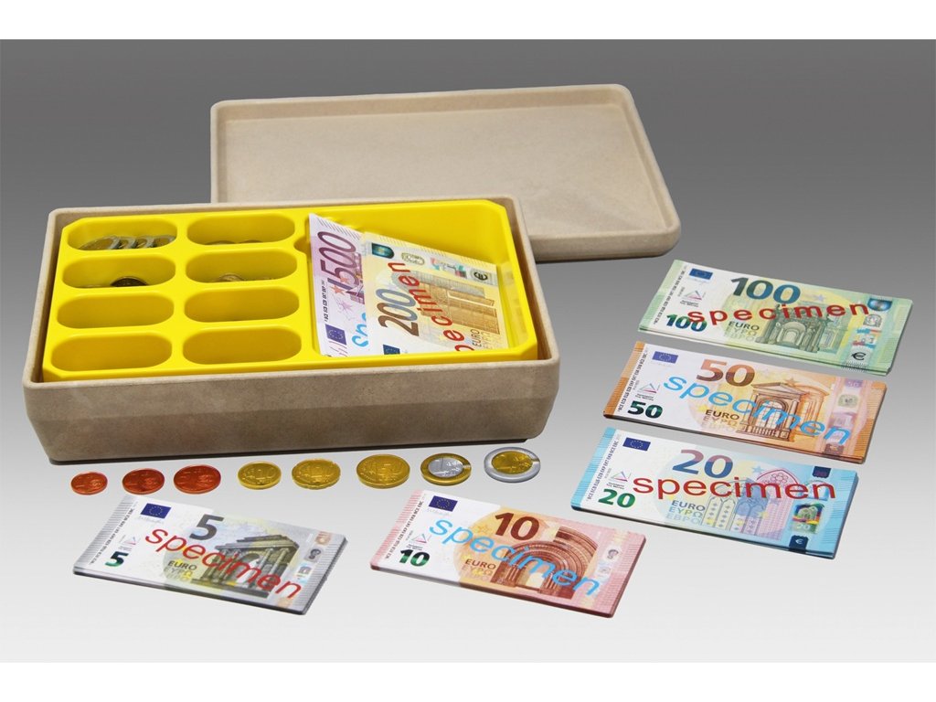 Pokladna včetně eurobankovek a euromincí. Bankovky vyrobené z pevného papíru jsou oboustranně potištěné a mají nápis SPECIMEN, aby byly jednoduše odlišitelné od skutečných. Velikostí odpovídají 85 % velikosti skutečných bankovek a jsou certifikovány Evropskou centrální bankou (Č. ECB R14/18033 ). Mince jsou co do velikosti, barvy a ražby téměř totožné s originálem. Děti se seznámí s bankovkami a mincemi a jejich hodnotou a mohou je využít při různých hrách. Jsou také vynikající pomůckou, aby se děti naučily, jak zacházet s penězi a uvědomily si jejich skutečnou hodnotu. Vyrobeno ze 100% recyklovaných materiálů, které jsou po použití opakovaně recyklovatelné. Uloženo v dřevěné krabičce s víkem s plastovou vložkou.