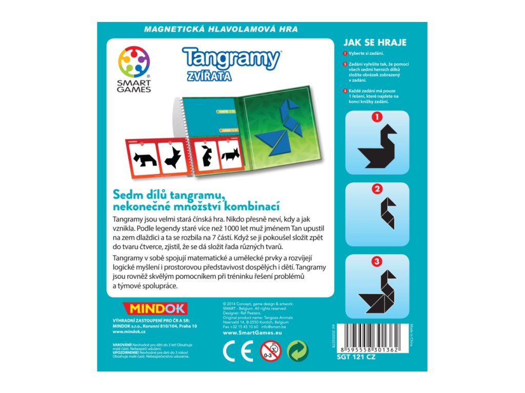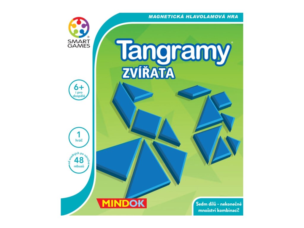 Hlavolamová hra pro 1 hráče z řady SMART games. 7 dílů tangramu, nekonečné množství kombinací. Tangramy jsou velmi stará čínská hra. Nikdo přesně neví, kdy a jak vznikla. Podle legendy staré více než 1000 let muž jménem Tan upustil na zem dlaždici a ta se rozbila na 7 části. Když se ji pokoušel složit zpět do tvaru čtverce, zjistil, že se dá složit řada různých tvarů.Doplňkové parametry