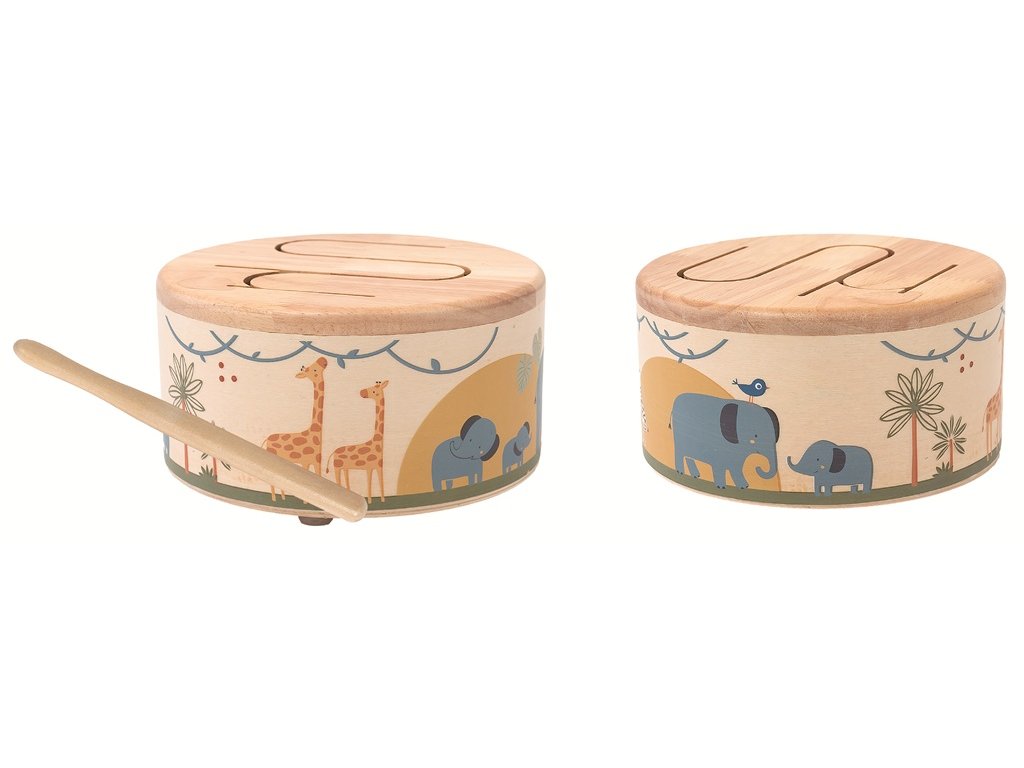 Veselý dřevěný bubínek s motivy safari přináší dětem radost z objevování rytmu i světa zvířátekNa bubínku najdete roztomilé ilustrace slonů, žiraf a zeber, které okouzlí každé malé dítě