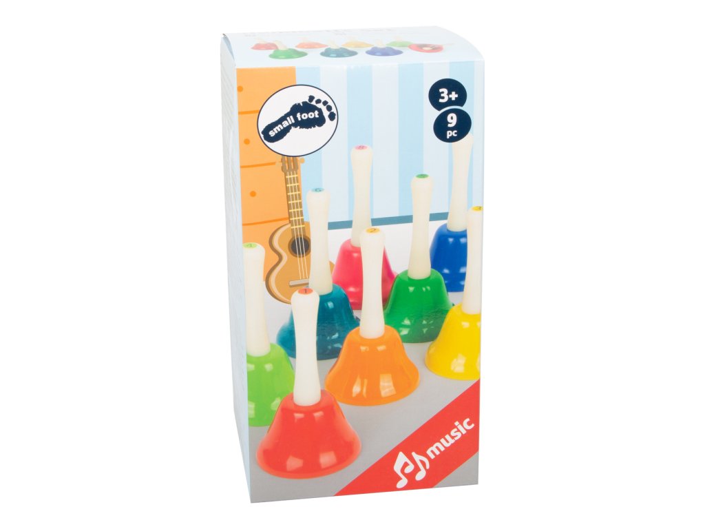 Toto je něco pro vaše uši! Těchto osm zvonečků nerozlišuje jen barva, ale také zvuk. Každý z nich je naladěn na jinou notu – C, D, E, F, G, A, H, C. V balení naleznete také noty s různými skladbami pro začátečníky a malé děti – noty jsou zaznačeny i barevně. Hudební set podporuje u dětí rozvoj rytmu, hudebního sluchu a také koordinace ruka-oko. V notách najdete písničky jako „Strýček Donald farmu měl“, „Rolničky“, „Třpyť se, hvězdičko“. Perfektní také do školek, prvních stupňů základních škol.