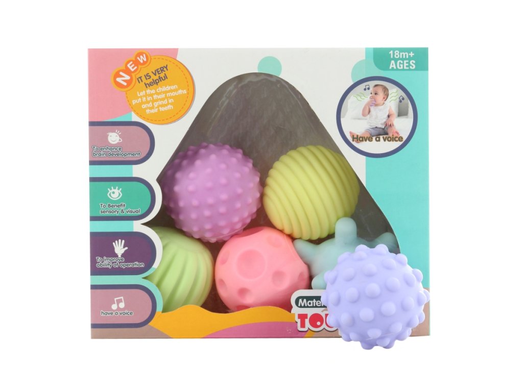 Sada senzorických míčků pro nejmenší děti. Míčky jsou různých tvarů a barev. Míčky jsou pískací. Baleno v krabicic. Rozměry balení cca 21x18x7 cm. Velikost míčku cca 5-6 cm. Věk 18m+Doplňkové parametry