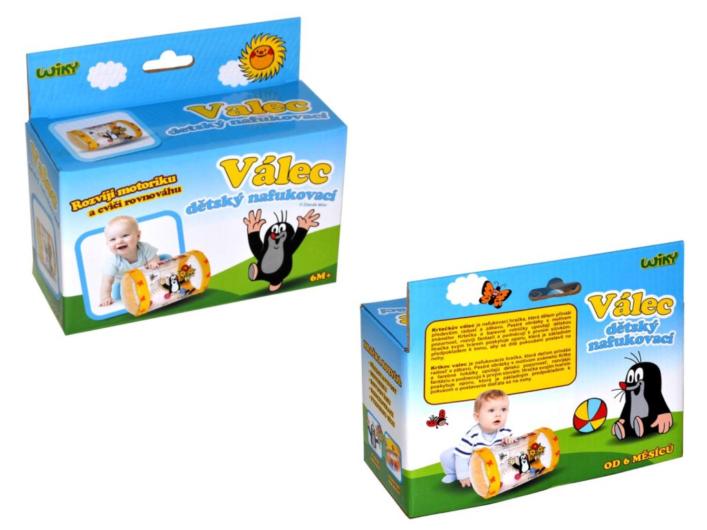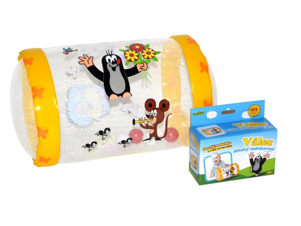 Nafukovací válec Krtek je hračka, vhodná pro malé děti od 6 měsíců. Pestré obrázky s motivem Krtečka a barevné rolničky uvnitř válce upoutají dětskou pozornost. Nafukovací válec svým tvarem poskytuje oporu, která je základním předpokladem, aby se dítě pokoušelo postavit na nohy. Nafukovací válec rozvíjí představivost, motoriku, cvičí rovnováhu, koncentraci a fyzickou sílu.Rozměr 40 cm.