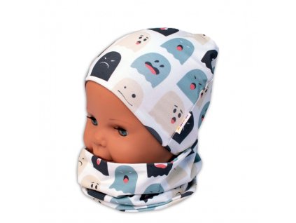 Baby Nellys Dvouvrstvá čepice + komínek Příšerky, bílá/mátová, vel. 92/98