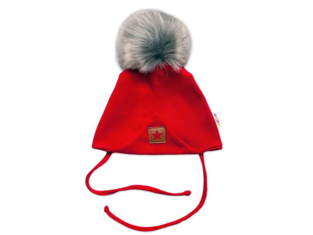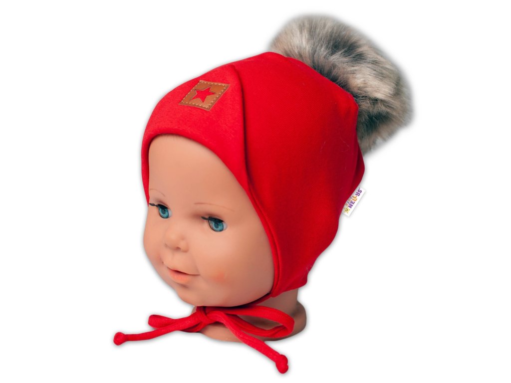 Baby Nellys Bavlněná dvouvrstvá čepice s bambulí na zavazování Star - červená