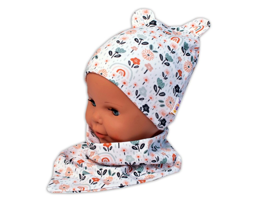 Baby Nellys Dvouvrstvá čepice s oušky + šátek Palouček, smetanová