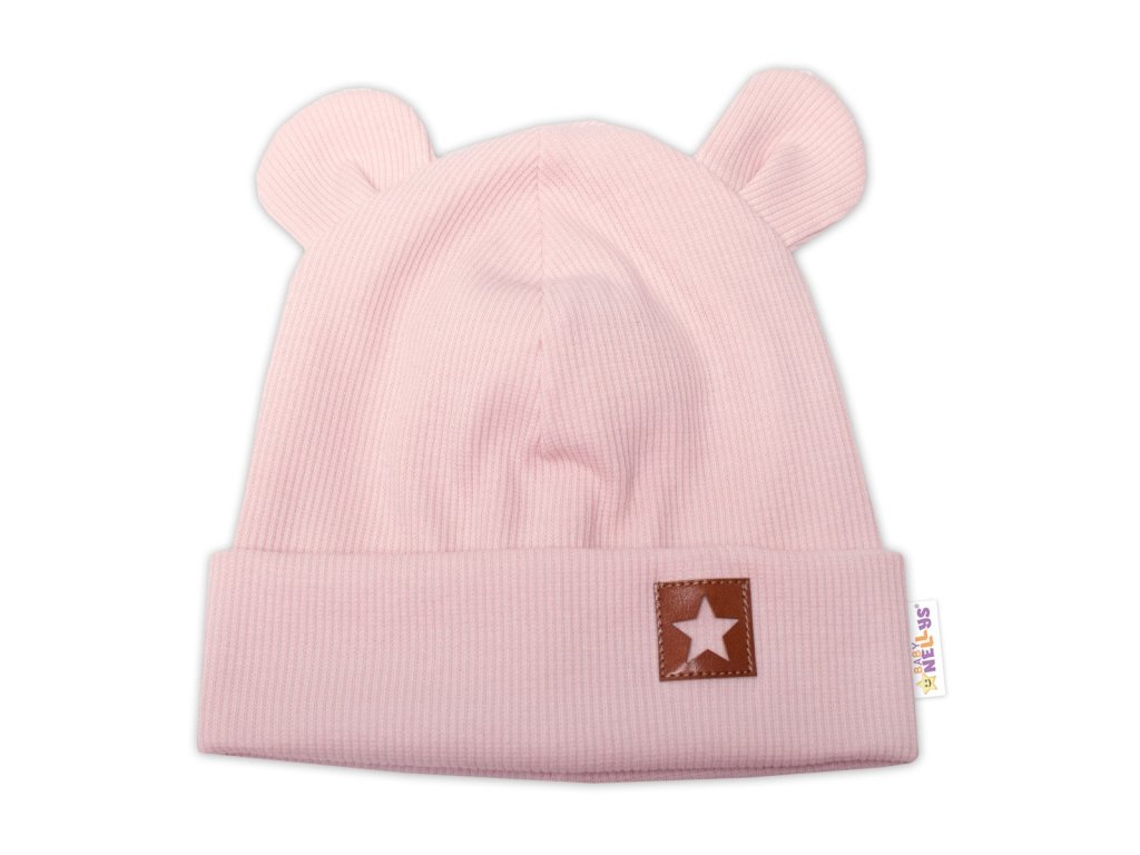 Baby Nellys Žebrovaná dvouvrstvá čepice s oušky TEDDY - pudrová