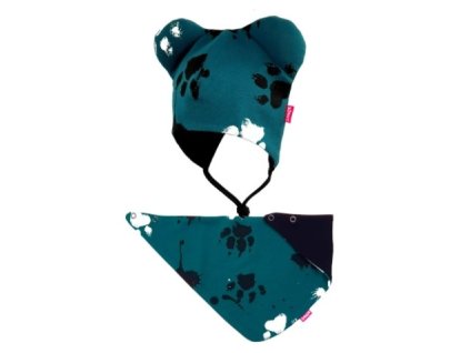 Bexa dvouvrstvá čepice na zavazování s oušky + šátek - Tlapky, petrolejová