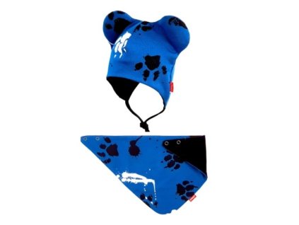 Bexa dvouvrstvá čepice na zavazování s oušky + šátek - Tlapky, petrolejová