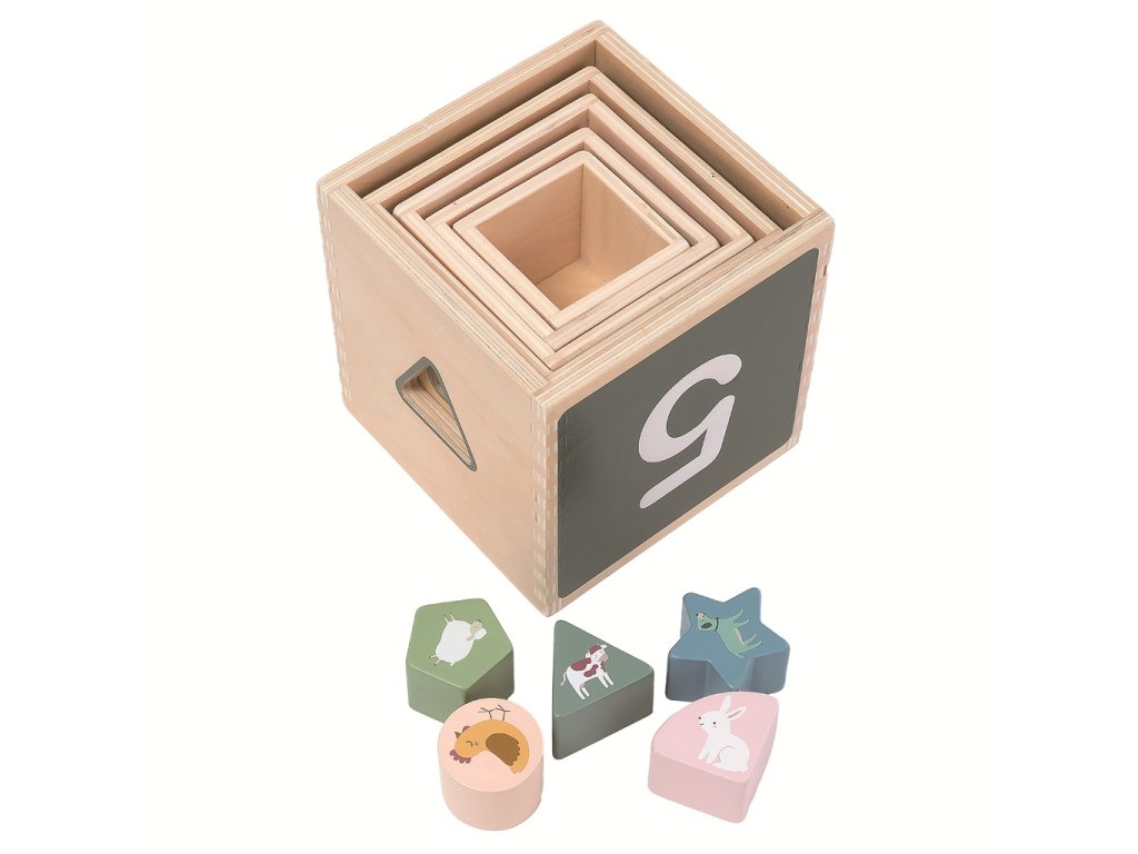 Čísla, tvary, barvy a zvířátka! Skládání je zábava! Tato dřevěná věž v jemných pastelových barvách se skládá z 5 kostek různých velikostí, které děti mohou stavět na sebe nebo rozložit vedle sebe. Na každé kostce je vyobrazeno roztomilé zvířátko, dobroty, kterými se živí, a číslo, které vyjadřuje počet zobrazených dobrot. Na jedné straně mají kostky otvor pro vhazování různých tvarů.