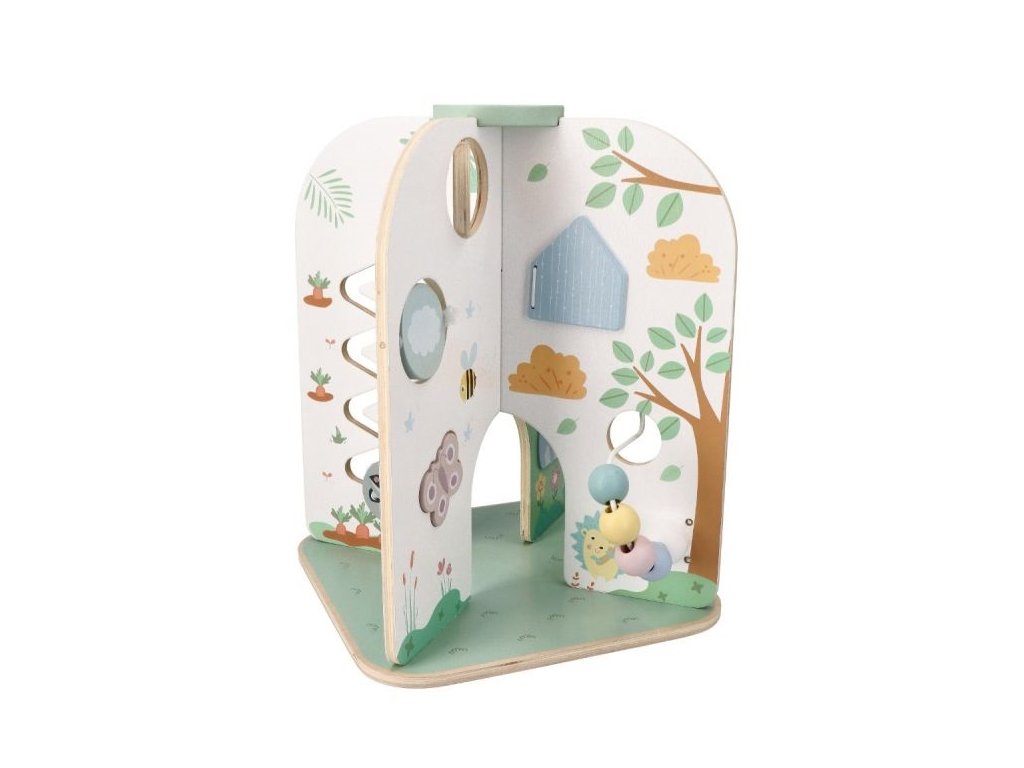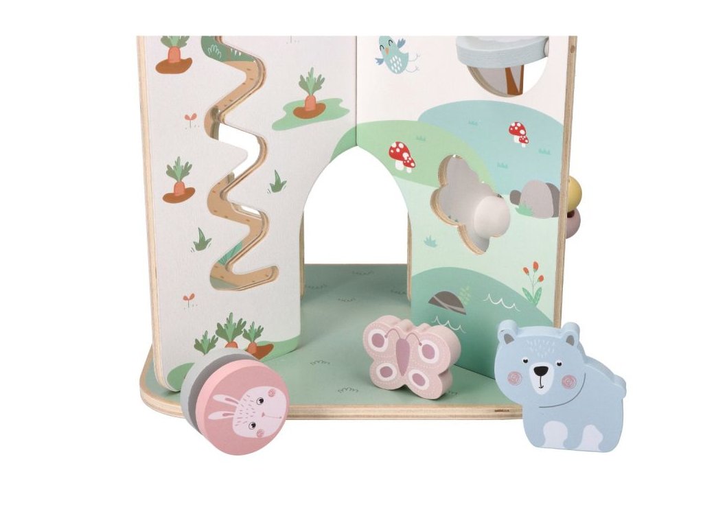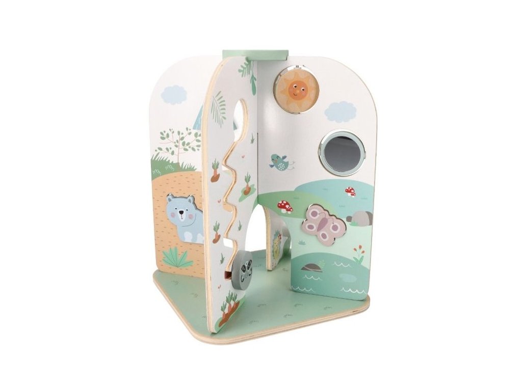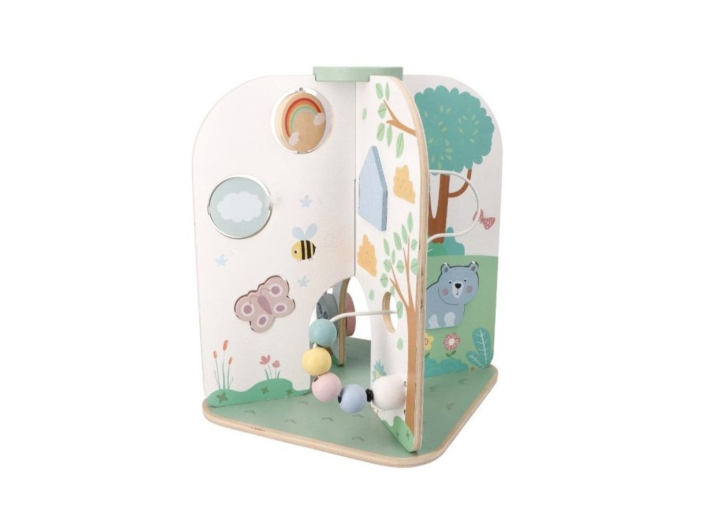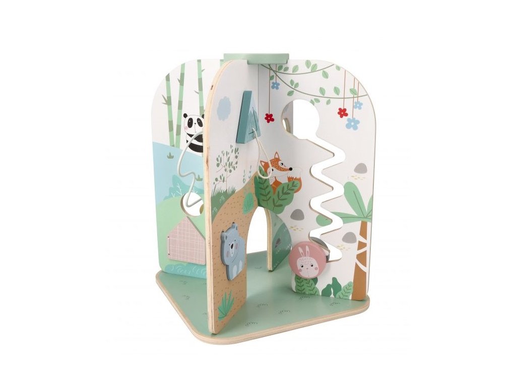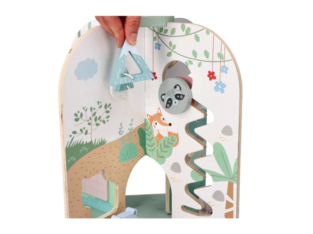 Dřevěné centrum aktivit v lese.Tato hračka je velkým centrem aktivity, díky kterému si dítě rozvíjí mnoho dovedností, jako je koordinace ruka-oko, motorika, logické myšlení a shoda. Rozvíjí především zvědavost a představivost.
