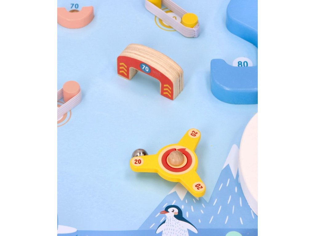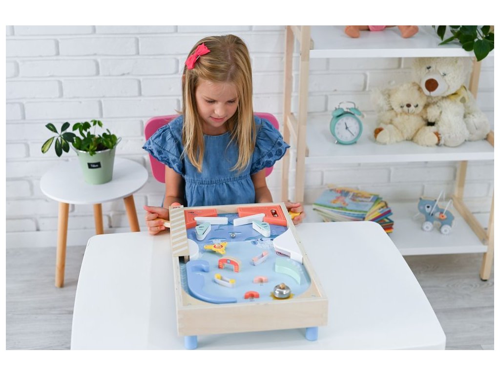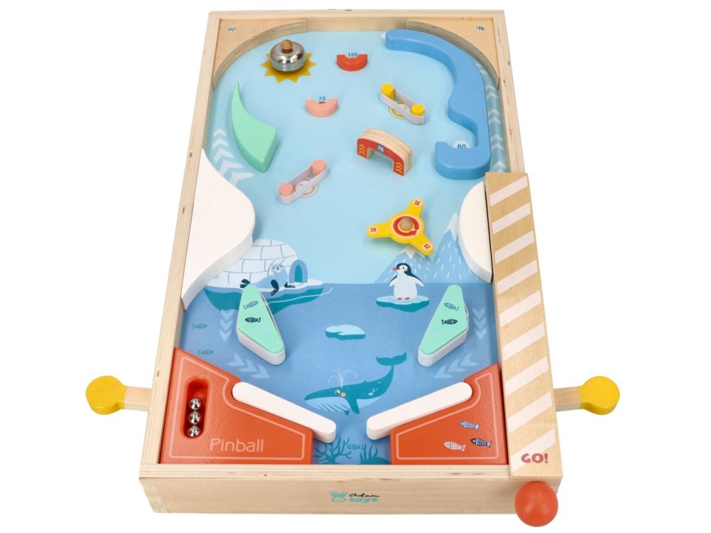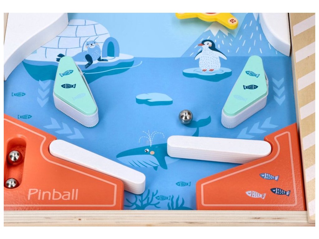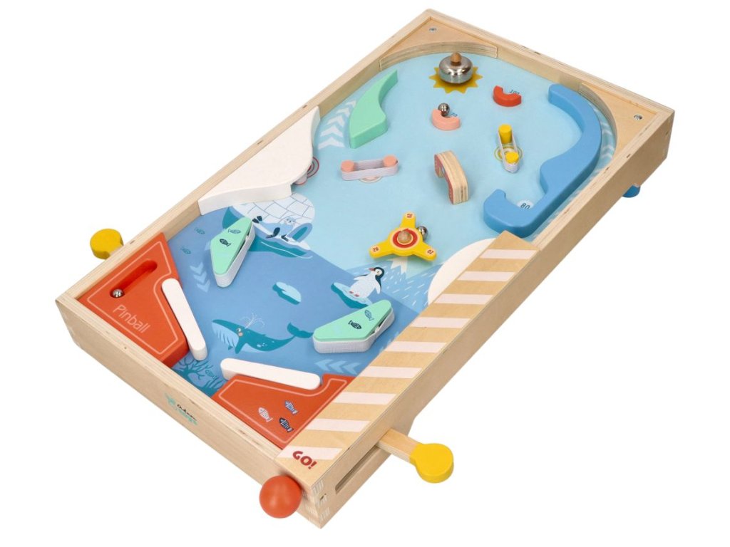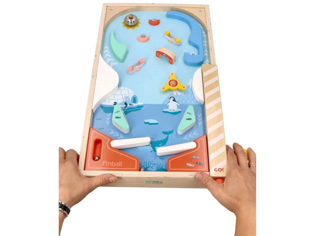 Pamatujete si hrací automaty? Hra zahrnuje dovedné manévrování s pákami na obou stranách hrací desky, abyste získali co nejvíce bodů nebo hráli co nejdéle. Zábava nejen pro děti. Na hraní pinballu budou rádi vzpomínat i dospělí.Masivní dřevěná deska vyžaduje pouze přišroubování dvou nožiček, aby míč mohl volně padat. Kulička se uvolní napnutím pružiny. Stačí vložit míč dovnitř, zatáhnout a hrát.