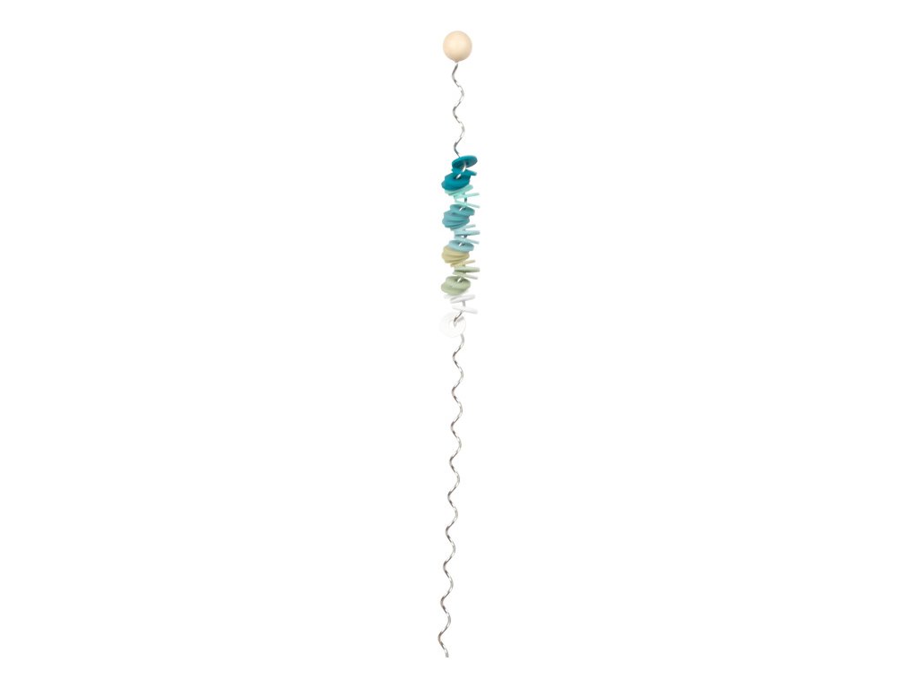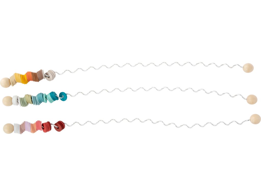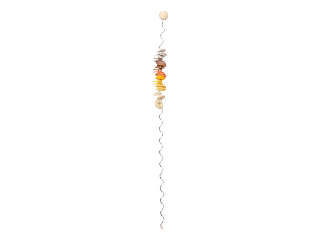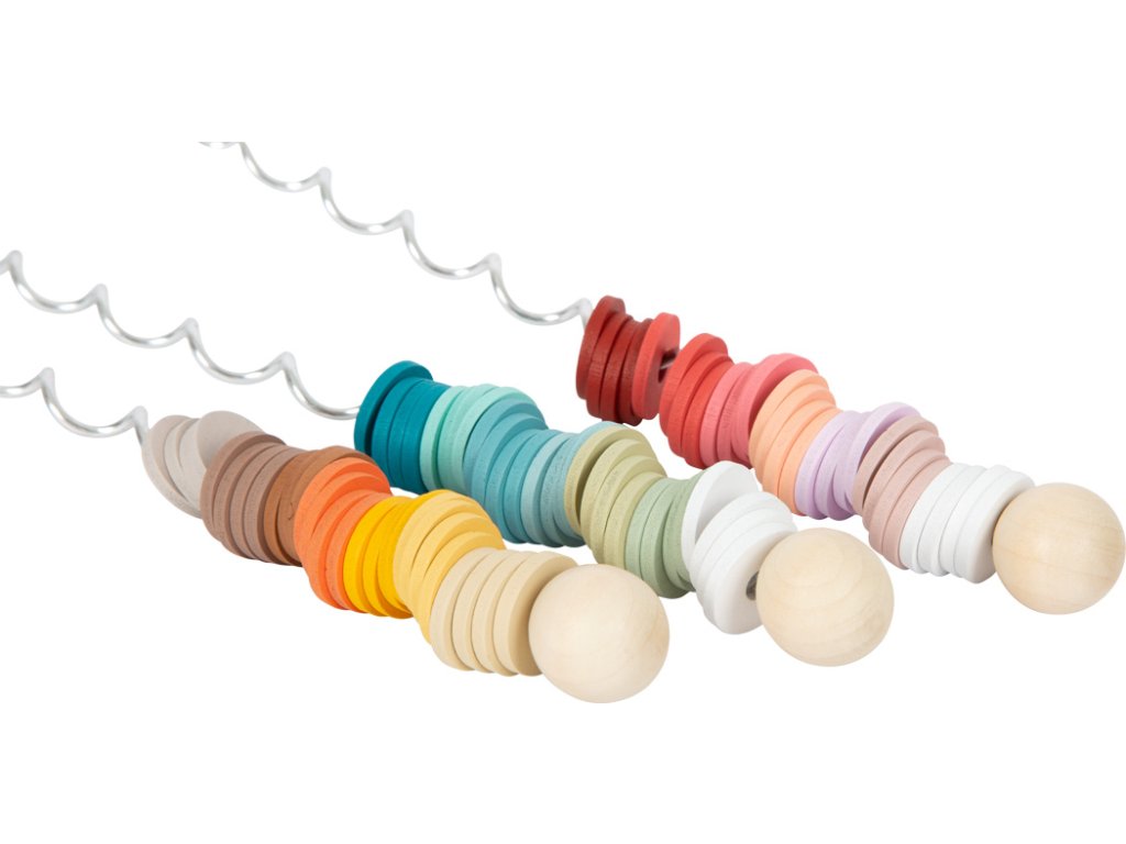 Když se barevné dřevěné kroužky spouštějí po kovových spirálových drahách, vytváří fascinující vizuální přehlídku barev a jemný líbivý zvuk. Když se tyčová dráha neustále posouvá tam a zpět, ztvárňuje vizuální show, která je pro děti nejen strhující, ale i velmi uklidňující.