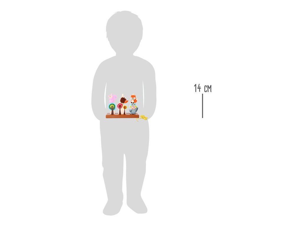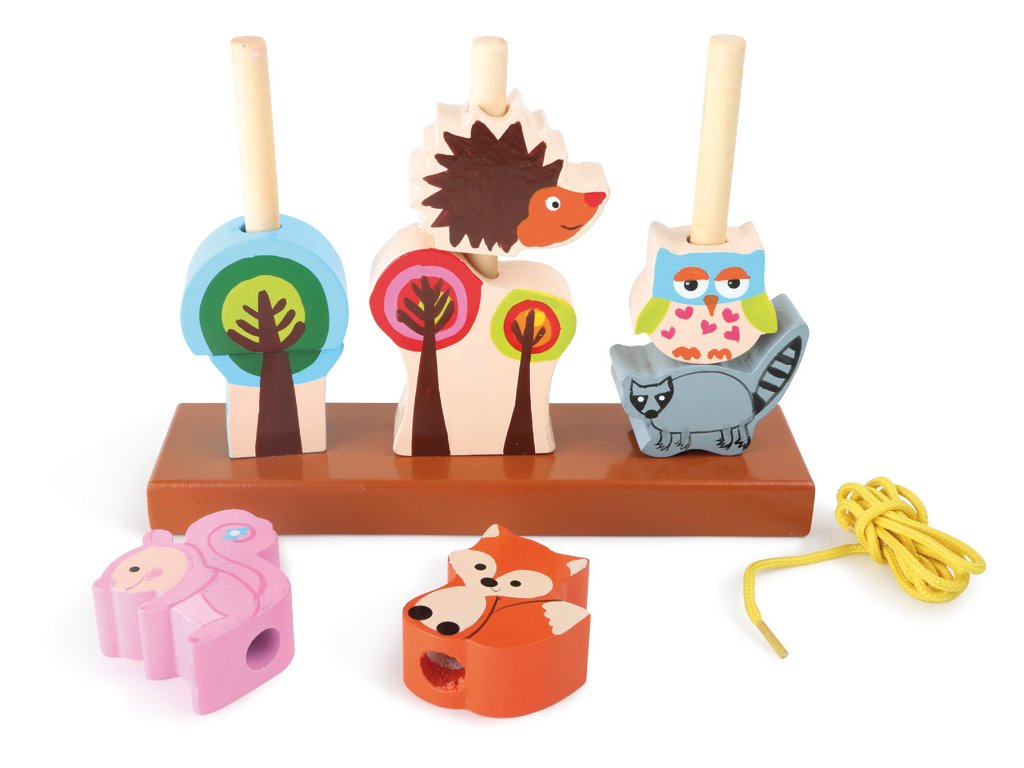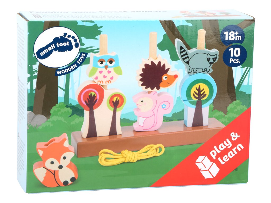 Tato sada umožňuje dílky navléct na šňůrku nebo na dřevěné kolíky. Ježek, liška, veverka, mýval a sova jsou hlavními hrdiny této hry. 3 stromy dotváří lesní atmosféru. Trénink může začít! Hlavní vlastnosti: 8 navlékacích dílů, stojan a šňůrkakompaktní velikost cvičí jemnou motorikuDoplňkové parametry