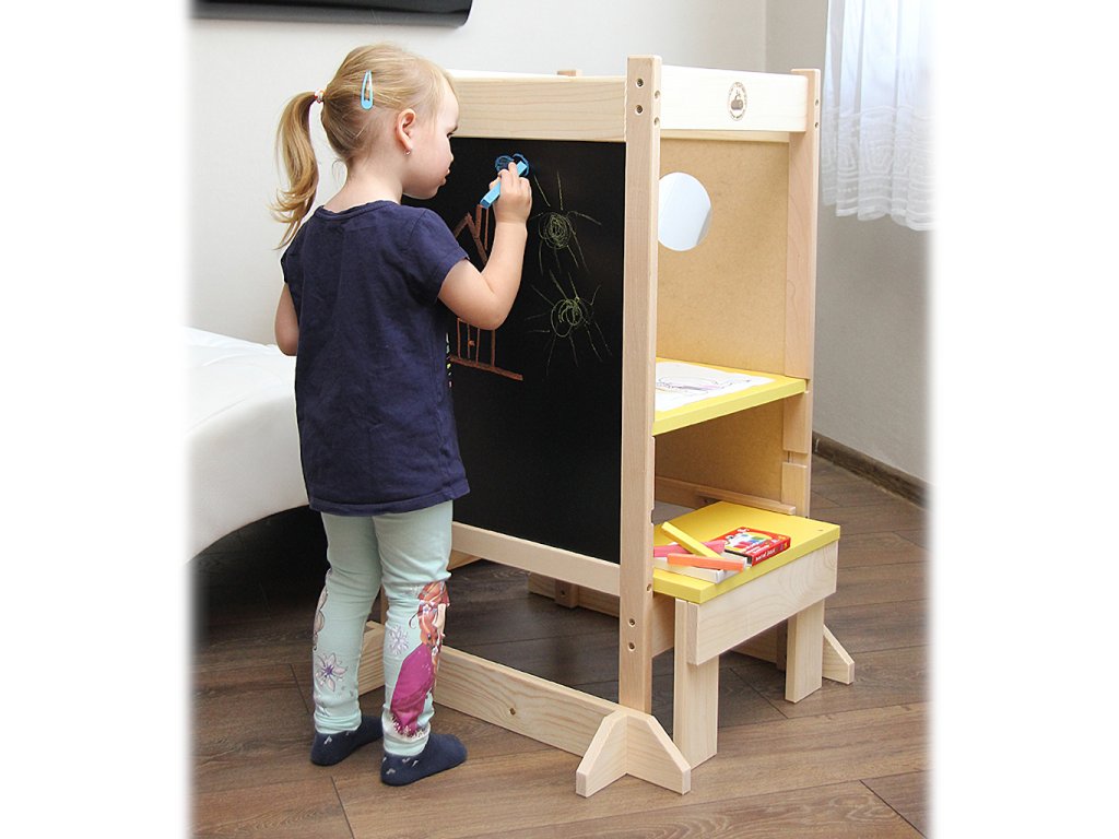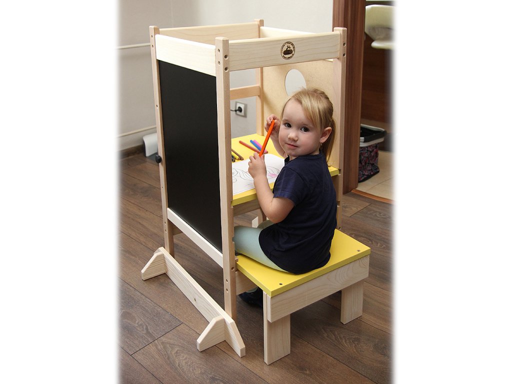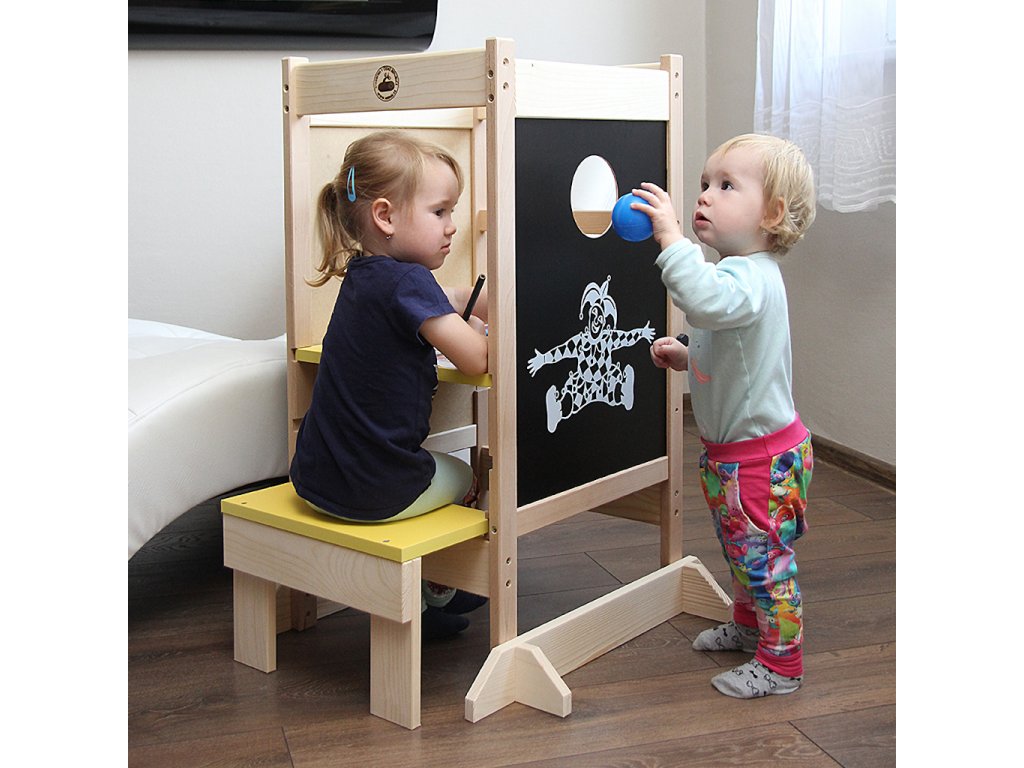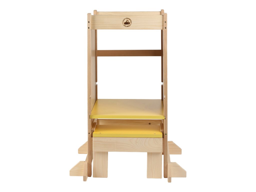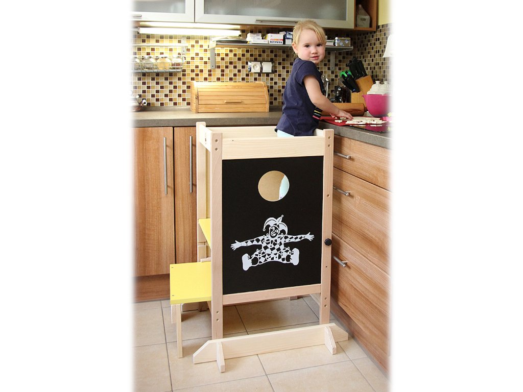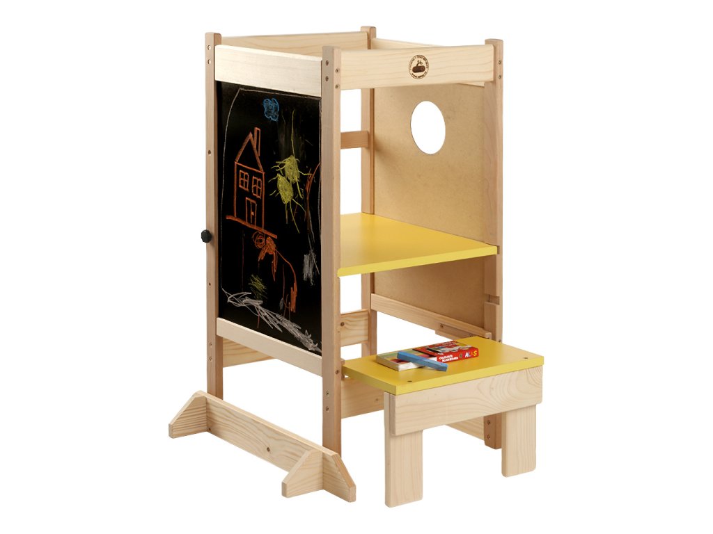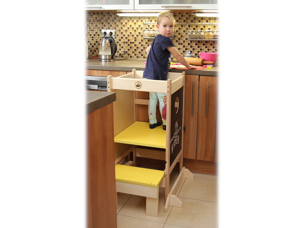 Učicí věž je víceúčelová stolička pro Vaše děti. Je vyrobená z kombinace bukového a smrkového dřeva. Umožňuje dítěti zapojit se do různých tvořivých činností u kuchyňské linky či pracovního stolu. Práce na kuchyňské lince zdokonaluje dítěti motorické schopnosti, a máte dítě neustále pod kontrolou. Věž dětem umožní být v úrovni pracovní desky, vidět vše, co děláte a tvořit s Vámi. Učicí věž se skládá ze stojací plochy, na které dítě stojí, schůdku, po kterém se na ni dostane a z ohrádky okolo. Při používání nenechávejte učicí věž v prostoru, ale vždy věž umístněte stranou naproti schůdku k pevné překážce (kuchyňská linka apod.).
