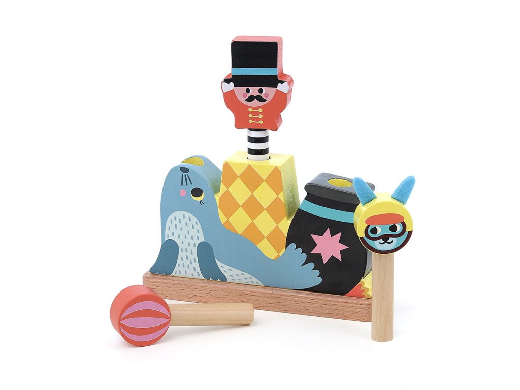 Krásná dřevěná vystřelovací hra s ilustracemi umělkyně Michelle Carlslund v motivu cirkusových číselBalón a dvě postavičky vyskakují z cirkusové základny