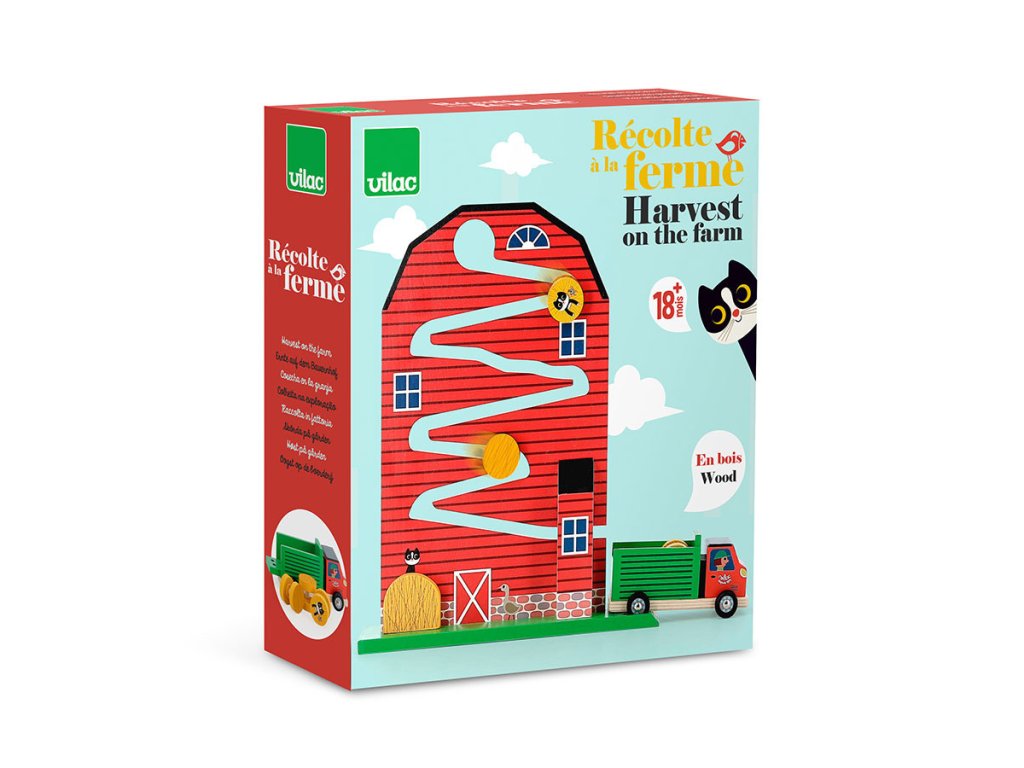 Je čas sklidit seno! Balíky už čekají na odvoz! Sledujte, jak se kutálí dolů rovnou do náklaďáku. Dřevěná farma s ilustracemi Ingely P. Arrhenius nabízí dětem od 18 měsíců hravý způsob, jak rozvíjet motoriku, koordinaci a představivost. Tři dřevěné balíky sena kloužou po dráze z farmy přímo do náklaďáku s otevíracími dvířky. Děti si procvičují přesnost pohybů, učí se vnímat příčinu a následek a vymýšlejí si vlastní příběhy o životě na venkově. Hračka v sobě spojuje pohyb, logiku i fantazii, a přitom přináší radost z objevování a jednoduché hry, která nikdy neomrzí.