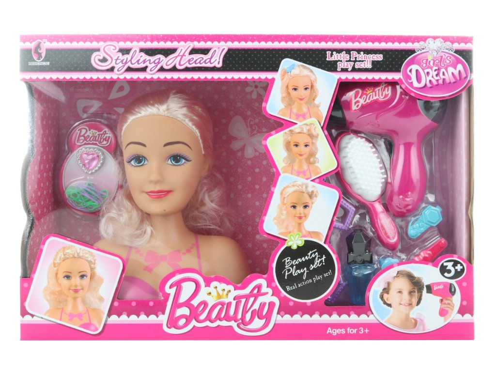 Sada krásy s česací hlavou. Balení obsahuje fén na baterie, hřeben, sponky, česací hlavu o velikosti cca 16 x 21 cm a další doplňky. Napájení fénu na 1 AA baterii (není součástí). Rozměry balení cca 40 x 27 x 11,5 cm. Věk 3+Doplňkové parametry