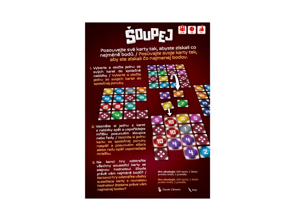 Hra, která Vás bude rozhodně bavit! Vyberte si kartu z nabídky a chytře ji zašoupněte do své mřížky. Rychlá a chytrá hra s velmi jednoduchými pravidly. Tato logická a zábavná hra s čísly se pro Vás stane návykovou. Principem hry je šoupat v každém tahu řadu karet ve své mřížce tak, abyste spojili stejná čísla k sobě s cílem získat co nejméně trestných bodů. Celou hru se tedy snažíte propojit co nejvíce karet stejné hodnoty, které se na závěr nepočítají. Za nepropojené karty získáváte záporné body. Tolik, kolik je hodnota karty.