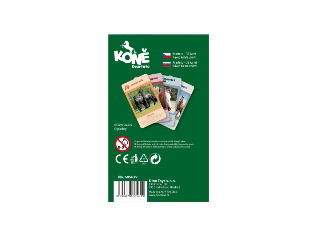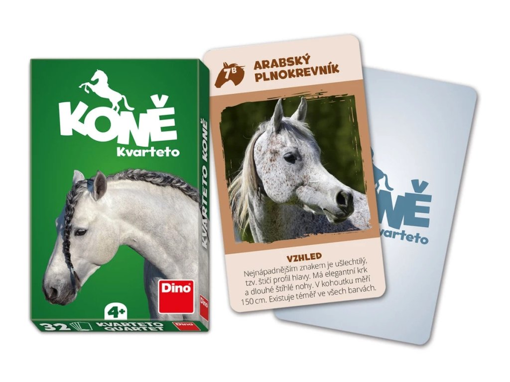 I nevycválané děti rázem zkrotnou, když před ně položíte balíček karet s obrázky koní. Nad krásným kvartetem si užijí spousty legrace a navíc se dozví zajímavé informace o různých plemenech. Hra je určena pro partičku 3 až 6 dětí a zvítězí v ní ten, kdo posbírá nejvíce čtveřic karet se shodnými symboly. Kvarteto je výborným nástrojem pro rozvoj komunikačních a kombinačních schopností a učí děti používat logické myšlení. Hrací sada byla vyrobena v ČR. Balení obsahuje: 32 karet v papírové krabičce, 1 návod . Věk 3+Doplňkové parametry