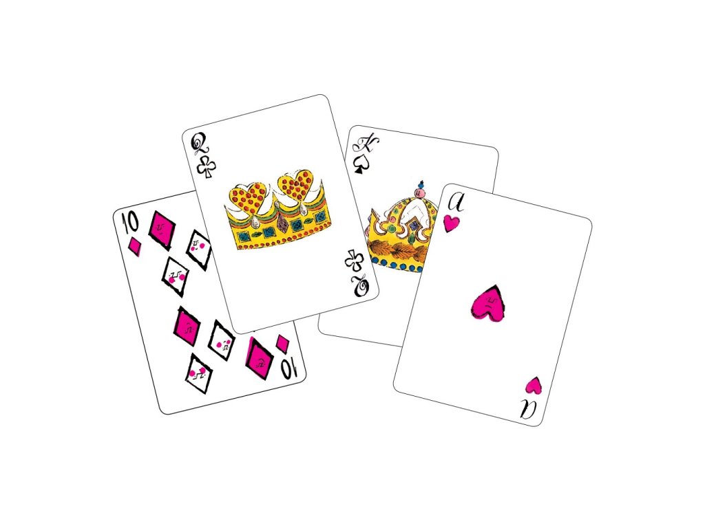 Klasická karetní hra v jedinečném provedení od Andyho Warhola. Obsahuje kresby zobrazující jednotlivé barvy, vytvořené samotným Warholem. Bílá a růžová srdce, diamanty, piky a kříže vám jistě vykouzlí úsměv na tváři pokaždé, když budete hrát. Hlavní vlastnosti: 52 karet s různými obrázkypro 2–4 hráčedesign: Andy WarholDoplňkové parametry