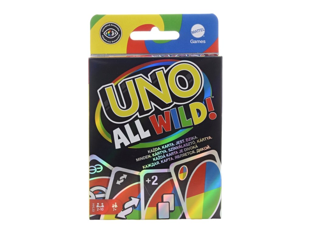 Ve hře UNO All Wild Divoké karty je každá karta divoká, díky čemuž je tato verze jedné z oblíbených rodinných her rychlá a ještě nepředvídatelnější! Nemusíte přiřazovat čísla nebo barvy jako u běžného UNO, ale není to tak snadné, jak to zní. Speciální karty zcela mění průběh hry! Najdete zde mj. divokou kartu „Postój pro dva“, díky které přeskočíte dva hráče místo jednoho, nebo divokou kartu „Vynucená změna“, díky které se zcela změní rozložení hry. Objevte také mnoho dalších jedinečných karet! Tato edice je stejně poutavá jako emotivní. Určeno pro 2-10 hráčů. Věk 7+Doplňkové parametry