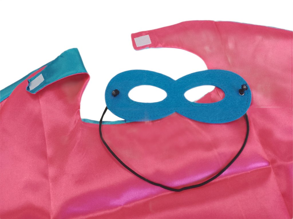 Maska je z měkké plsti a drží na hlavě pomocí elastické gumičky, což zaručuje pohodlné nošení po celý den. Kombinace pláště a masky vytváří zábavný převlek, který se hodí nejen na karneval, ale i pro každodenní hraní doma.
