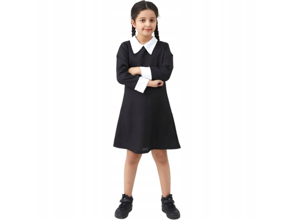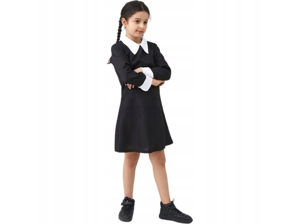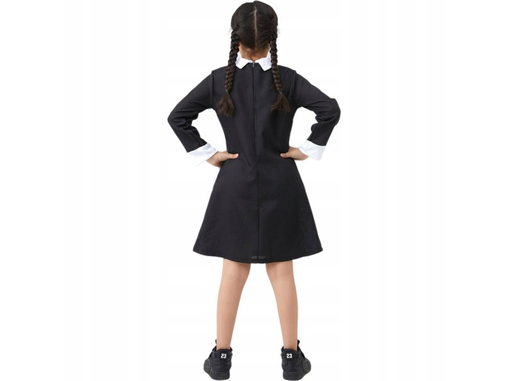Dětský karnevalový kostým Wednesday classic s parukou. Tento kostým je skvělou volbou pro dětské karnevaly, Halloween, nebo jakoukoli jinou událost. Kostým je jednoduchý, lehký, v klasickém černo-bílém provedení s límečkem. Díky kvalitnímu zpracování a pohodlným materiálům bude vaše dítě v tomto kostýmu vypadat a cítit se skvěle. Za originální proměnu do jedné z nejznámějších postav z kultovní Adamsovy rodiny - Wednesday, jistě dítě získá spoustu chvály. Poznámka pro rodiče: Nezapomeňte přidat nějaké temné make-upy, které doplní kostým a paruku, aby dítě co nejvíce podobala svému filmovému vzoru. Není určeno pro děti do 3 let Obsah balení šaty paruka Rozměry (poloviční obvody měřené naplocho) délka šatů 62 cm (měřeno od ramene) šíře v podpaží cca 31 cm šířka pasu cca 27-33 cm Délka rukávu měřená od ramene cca 36 cm velikost 104-110 S (výška postavy) Materiál 100% polyester Údržba žehlete každou vrstvu zvlášť přes bavlněný ubrousek, nebo pouze napařováním prát pouze ručněDoplňkové parametry