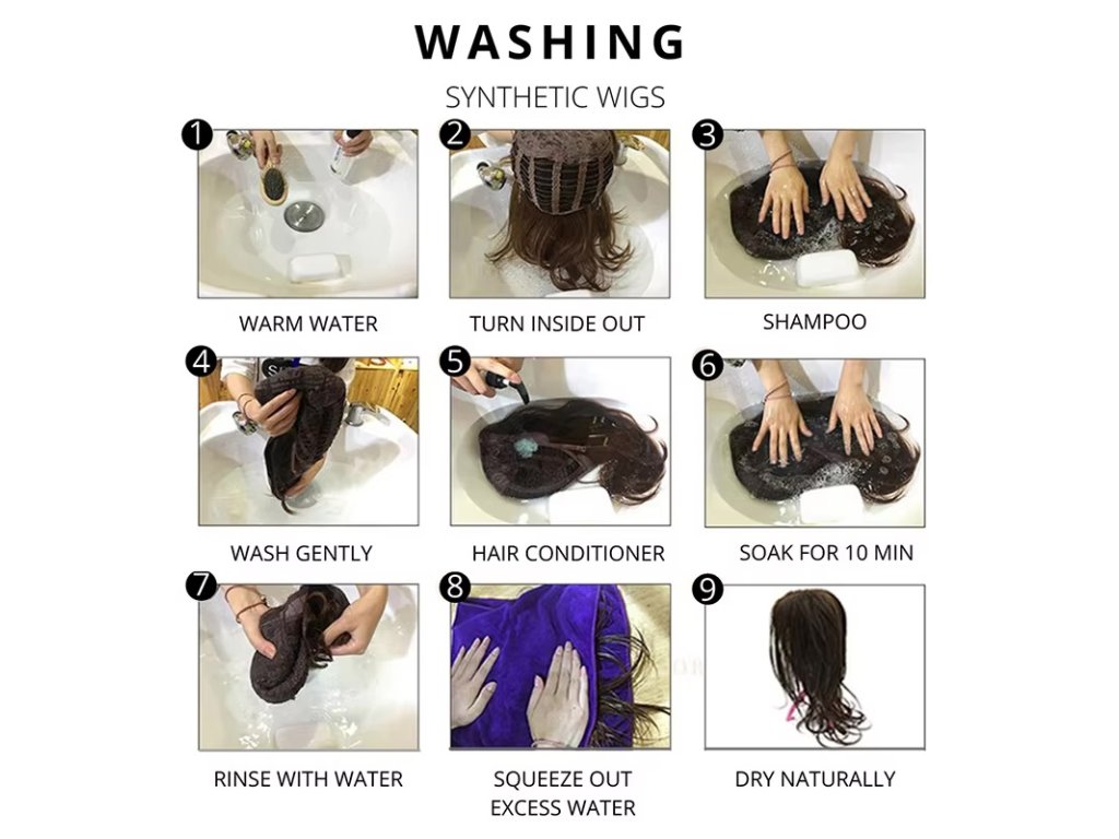 Ponořte paruku do teplé vody a otočte ji naruby. (viz obrázek „Washing Synthetic Wigs“)