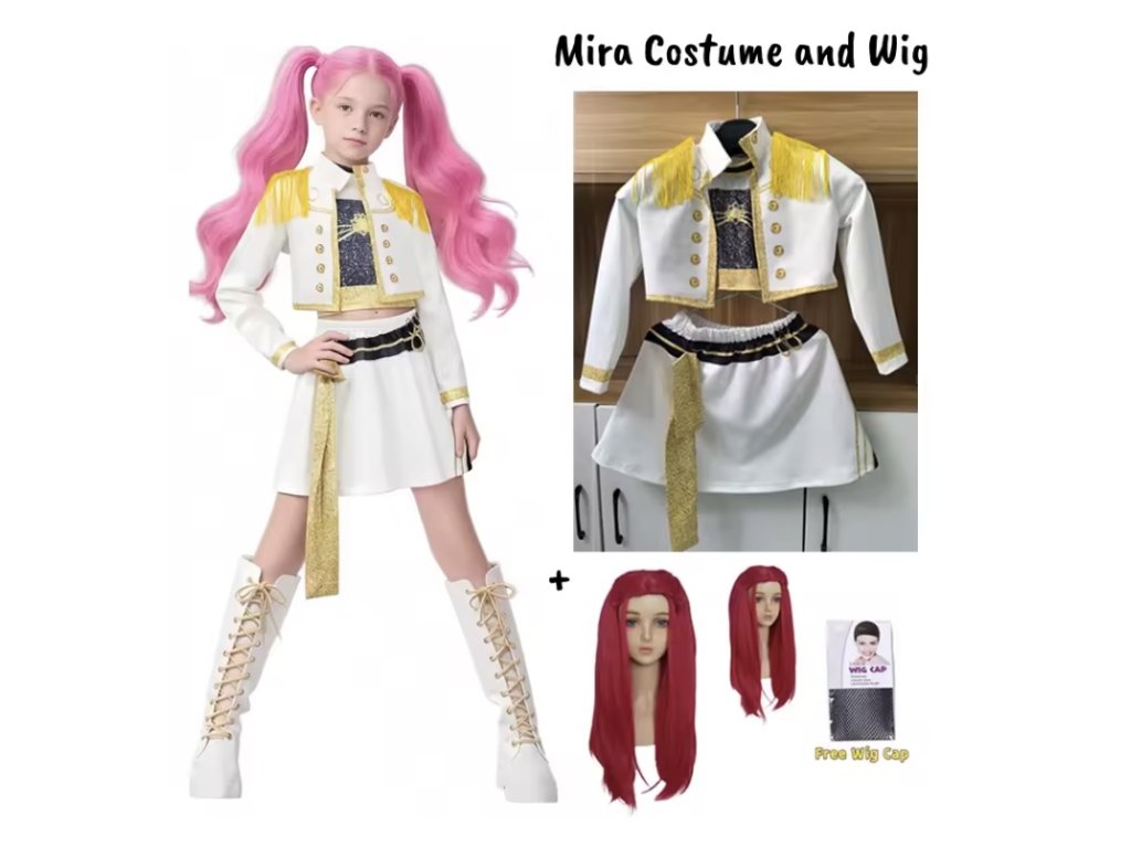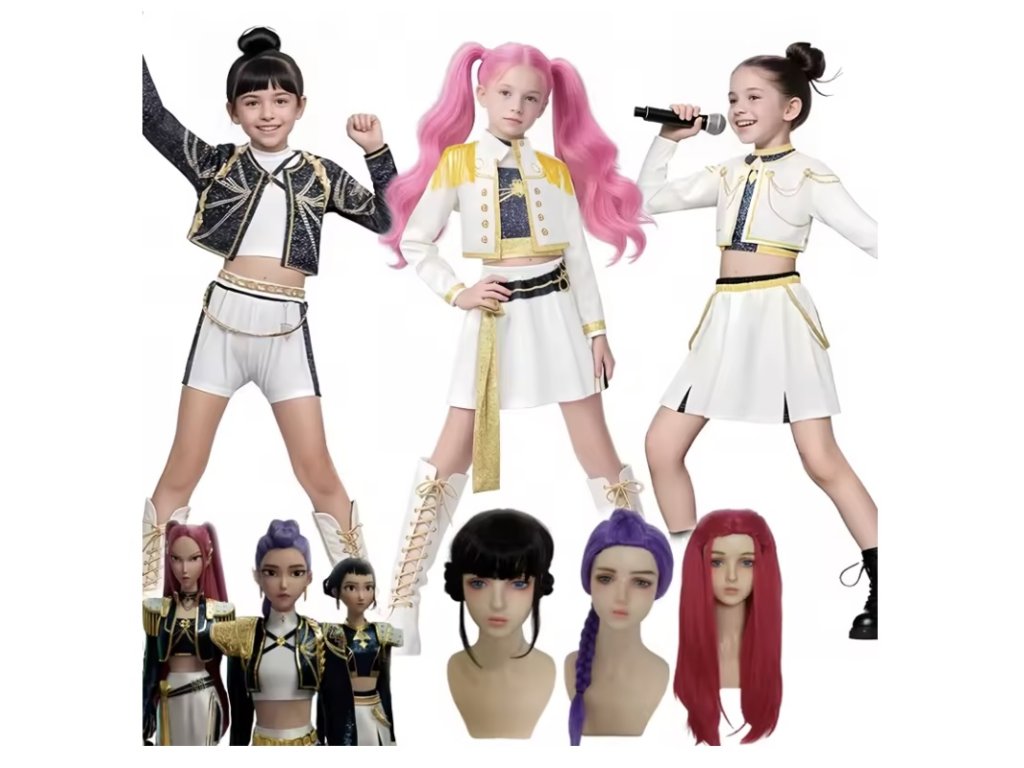 👉 Každá paruka odpovídá stylu dané postavy – Rumi s dlouhým fialovým copem, Zoey s krátkým sestřihem a culíky a Mira s dlouhými růžovými vlasy.