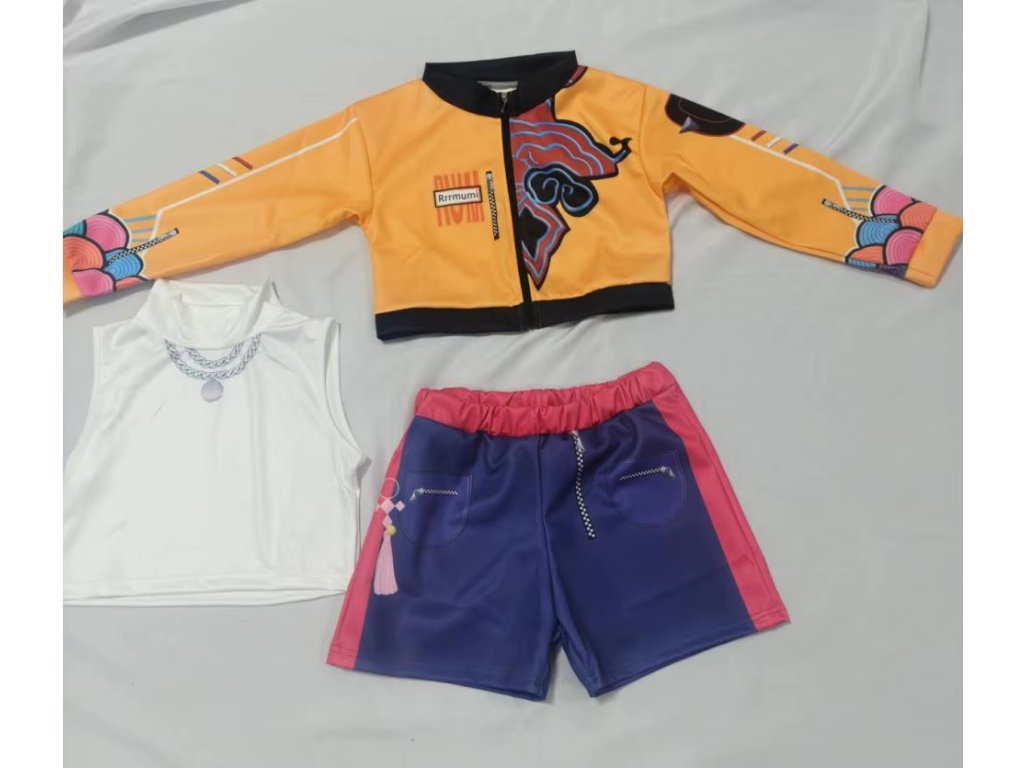 Rumi set – oranžová bunda s kraťasy a bílým topem, ideální pro odvážný a energický vzhled.
