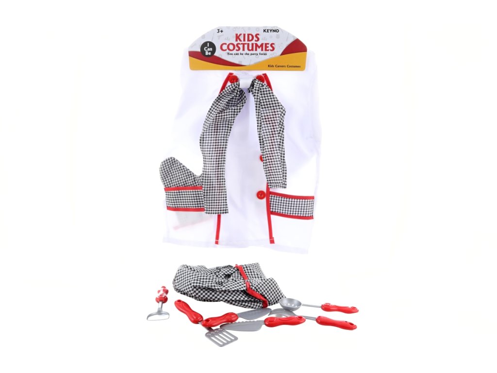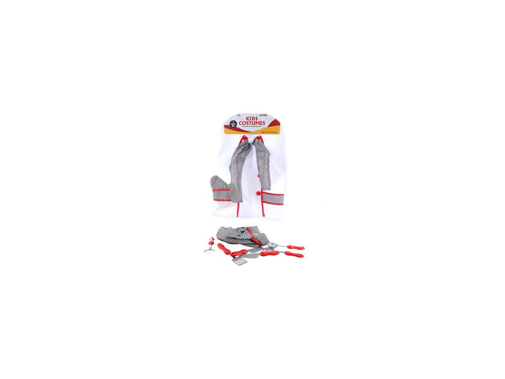 Kostým kuchař. Balení obsahuje kuchařský kabátek, rukavici, čepici a sadu nádobí. Materiál plast+polyester. Rozměry kabátku 40x50 cm. Baleno v sáčku. Rozměry balení 38x56x4 cm. Věk 3+Doplňkové parametry