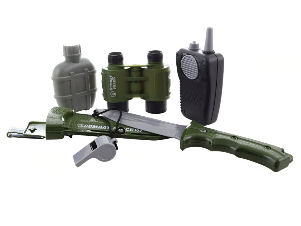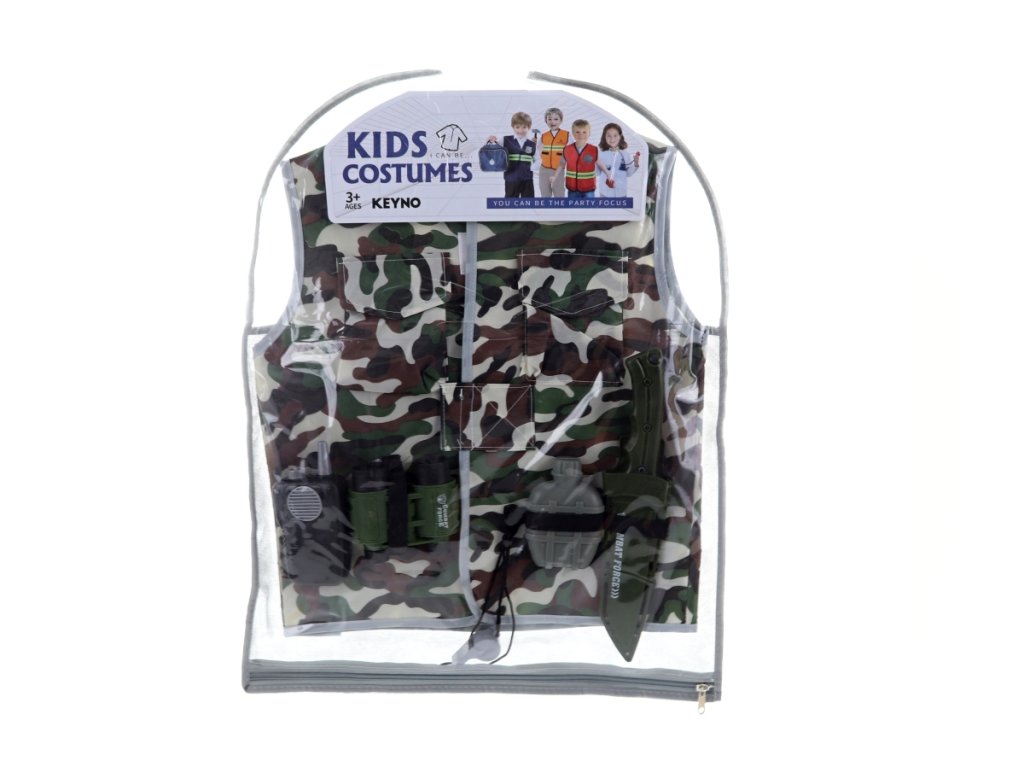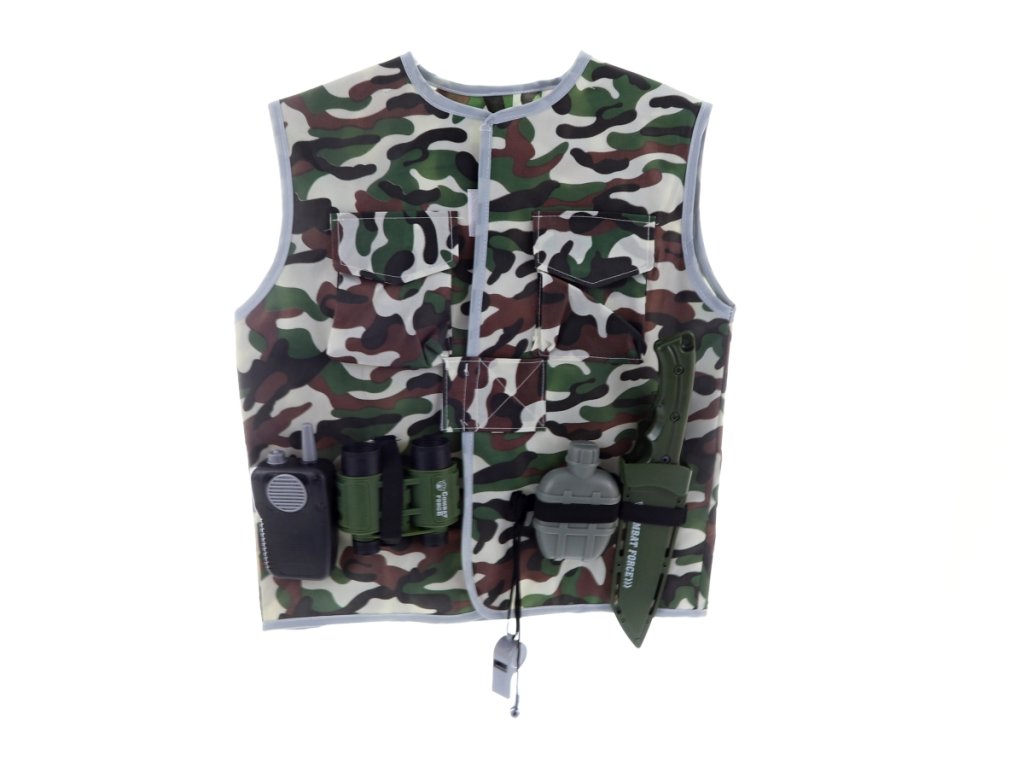 Kostým voják. Sada obsahuje vestu, vysílačku, dalekohled, butelu, píštalku a nůž v pouzdře (čepel měkká, ohebná). Materiál plast+polyester. Baleno v sáčku na zip. Rozměry vesty 37x45 cm. Rozměry balení 43x59x4 cm. Věk 3+Doplňkové parametry
