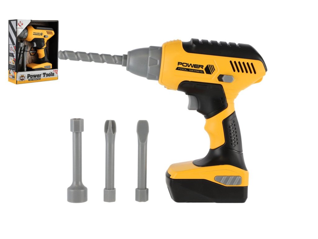 Aku Vrtačka nářadí plast 15x18cm s doplňky na baterie se zvukem v krabici 18x22x6cm