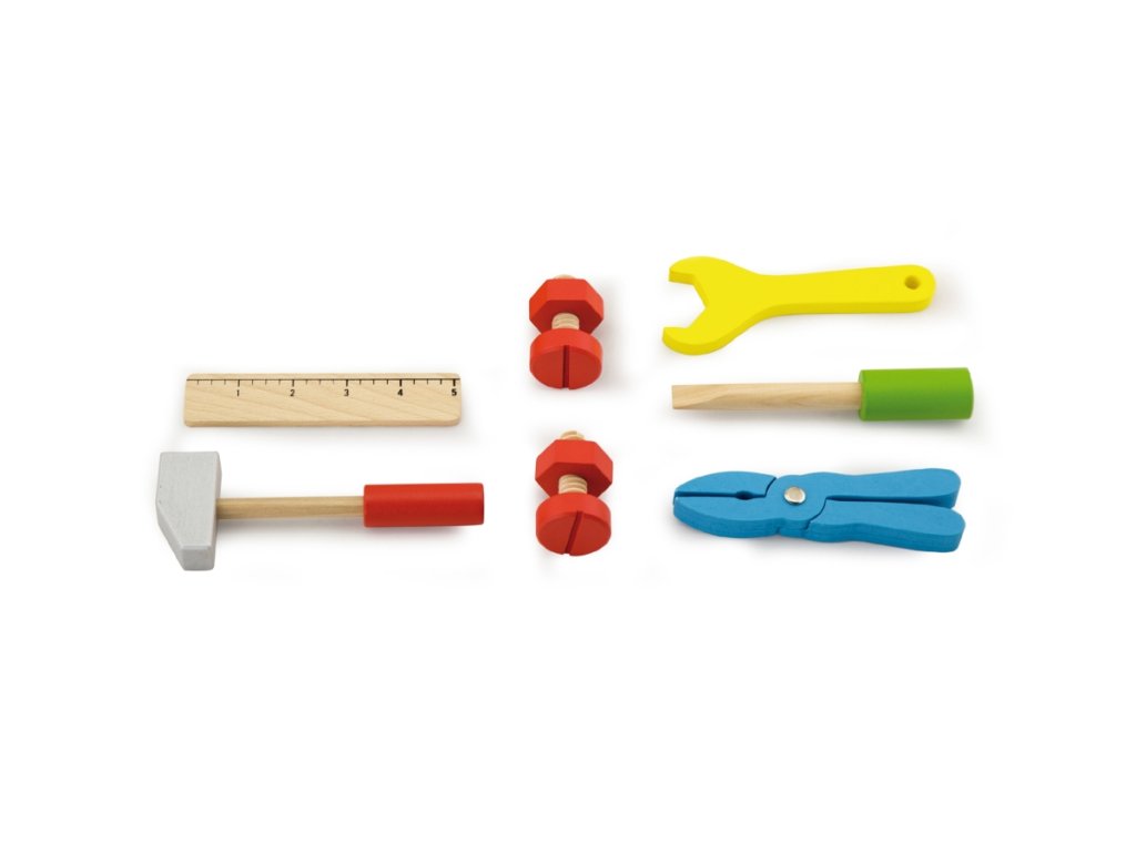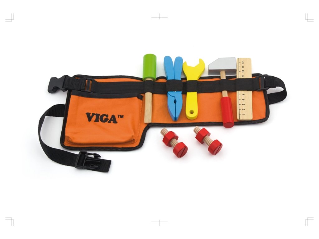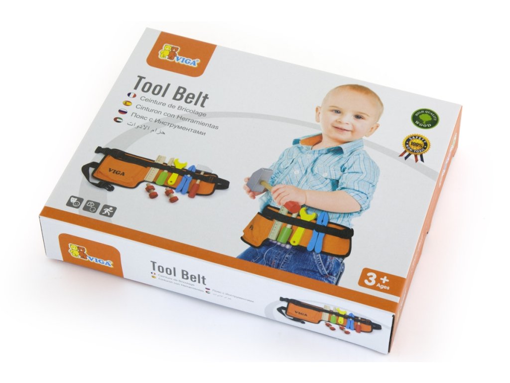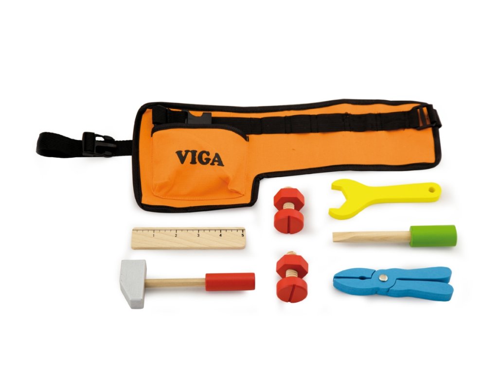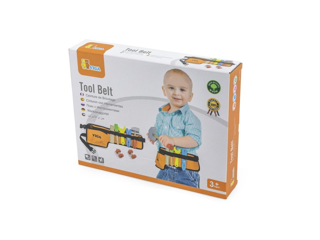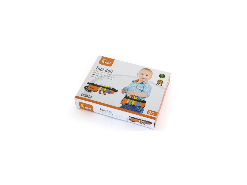 Opasek s dřevěným nářadím (obsahuje kladívko, klíč, šroubovák, metr, šroubky a matice, kleště). Rozměry opasku cca 36 x 18 x 2,5 cm. Rozměry balení cca 27 x 21 x 5 cm. Věk 3+Doplňkové parametry