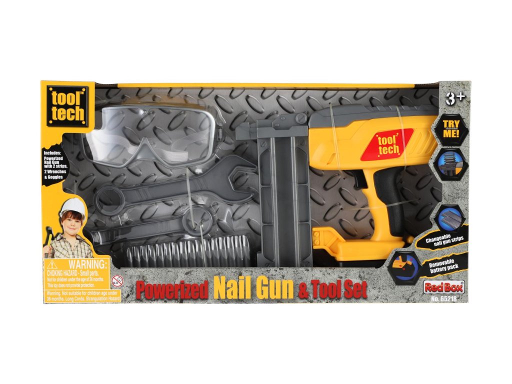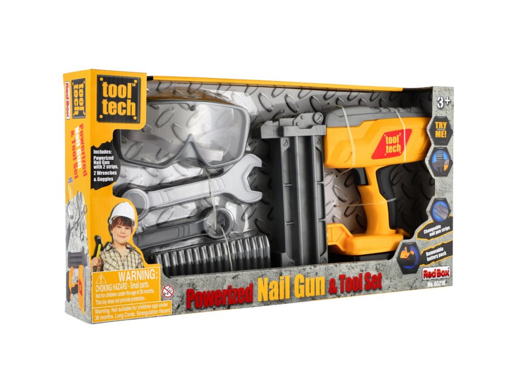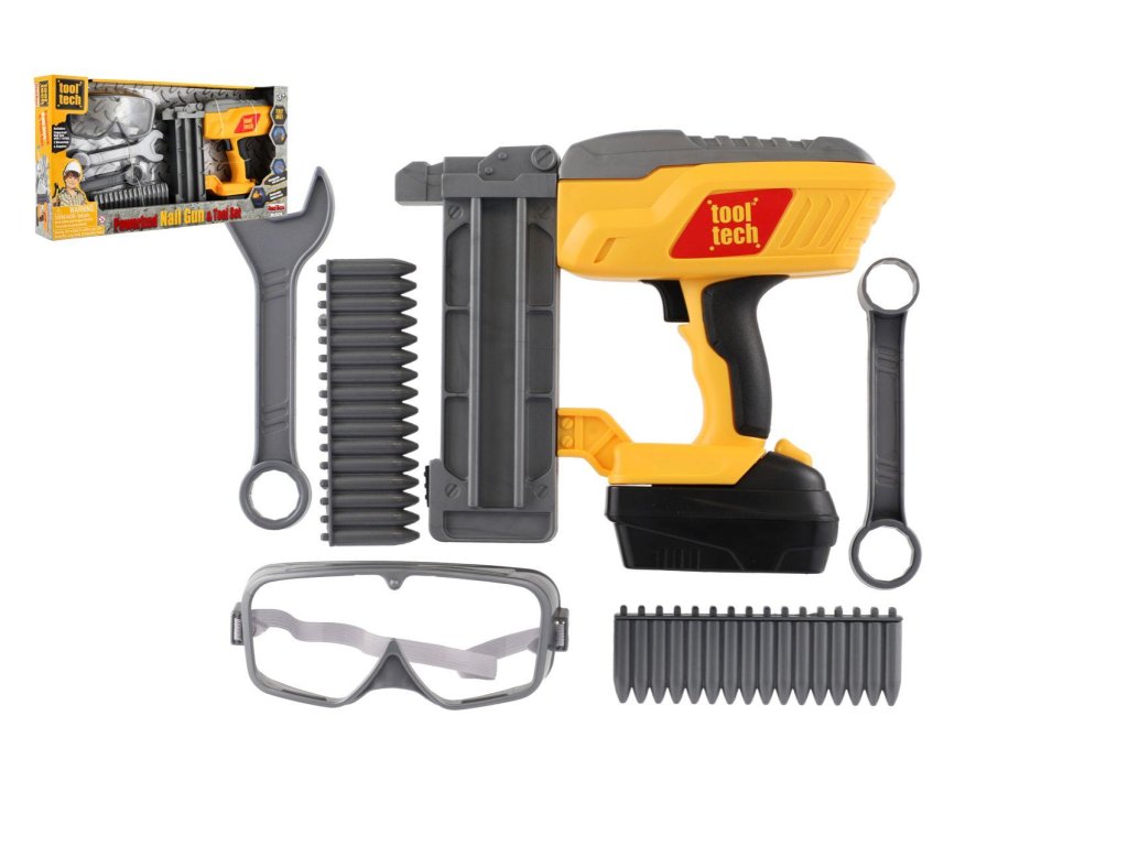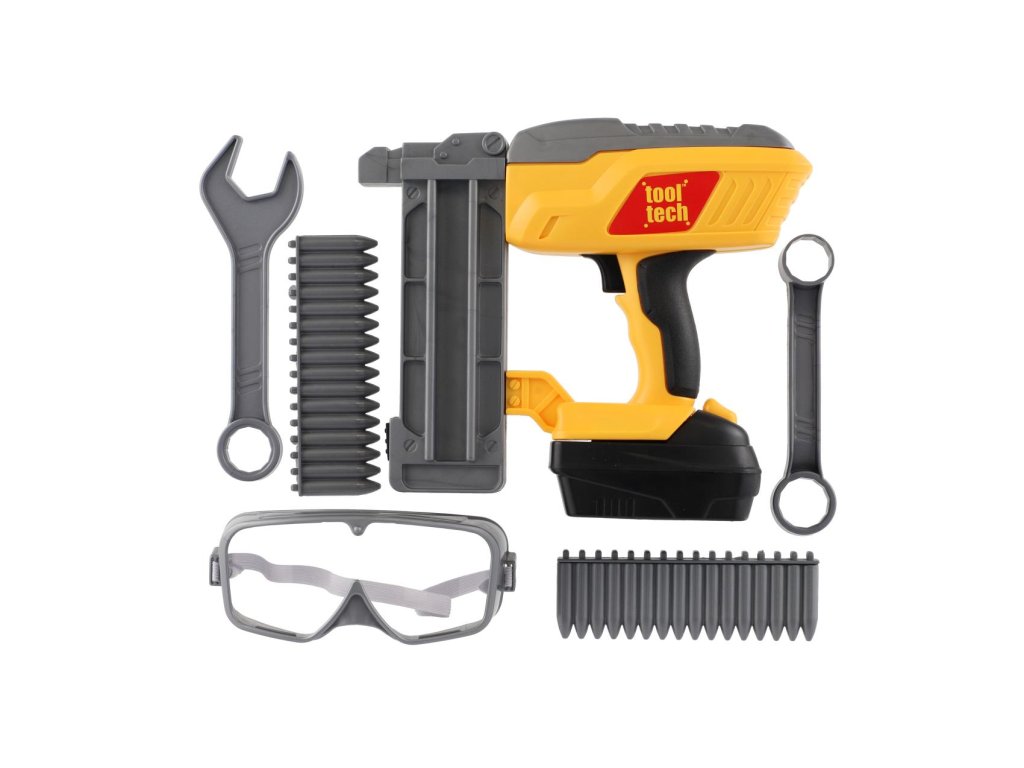 Nádherná sada pro malé kutily. Souprava obsahuje ochranné brýle, klíče, plastové náboje hřebíky a samozřejmě nastřelovací pistoli. Užijete si tak spoustu zábavy při drobných opravách. Pistole má vyjímatelný pack, kde jsou uloženy baterie. Baterie 2x AA jsou součástí balení.Rozměry balení 42 x 22 x 7 cm.