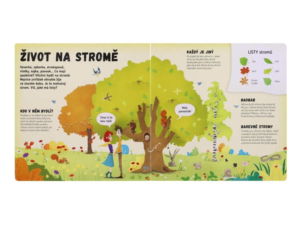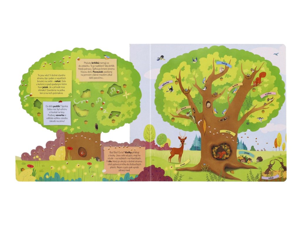 Poznej život na stromě!Vítr se prohání vysoko v koruně stromu. Větvičky o sebe pleskají a kdesi dole u velké škvíry někdo zaklepal na kmen stromu. „Datle, co to vyvádíš?“ zavrtěla sojka hlavičkou. „Podívej, vzbudil jsi veverky!“ Pavouček zavěšený na jemném vlákně mezitím utkal další pavučinu a v hnízdě zakukala kukačka. Tak je to na stromě skoro každý den. Jeden dub je jako dům, ve kterém bydlí spousta zvířat. Některá z nich už možná znáš. Tak pojď dál, vezmeme tě dovnitř, na návštěvu do starého stromu…
