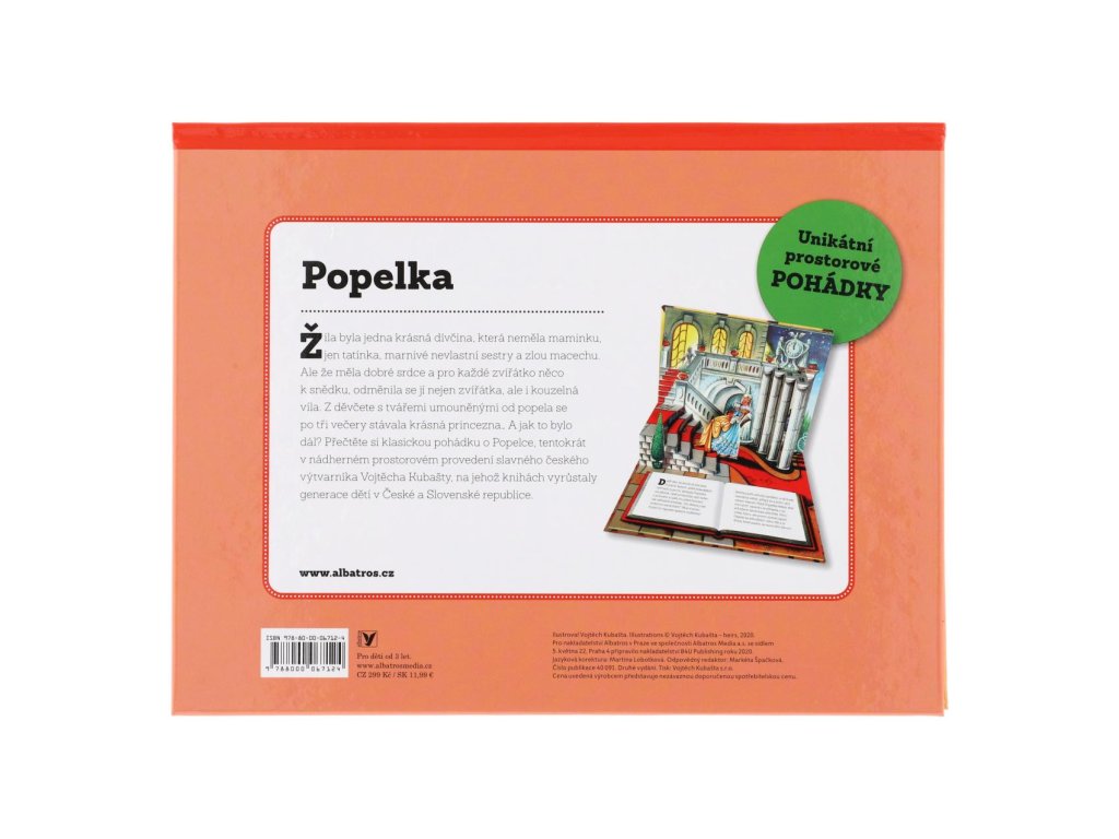 Zamilujte si znovu klasický pohádkový příběh! Oblíbené prostorové leporelo od významného českého výtvarníka.Žila jedna krásná dívka, která měla jen tatínka, marnivé nevlastní sestry a zlou macechu. Ale že měla dobré srdce a pro každé zvířátko něco k snědku, kouzelná víla se jí odměnila. Z děvčete s tvářemi umouněnými od popela se stala po tři večery princezna. Přečtěte si klasickou pohádku o Popelce, tentokrát v prostorovém provedení slavného českého výtvarníka Vojtěcha Kubašty, s jehož knihami vyrůstaly celé generace dětí.