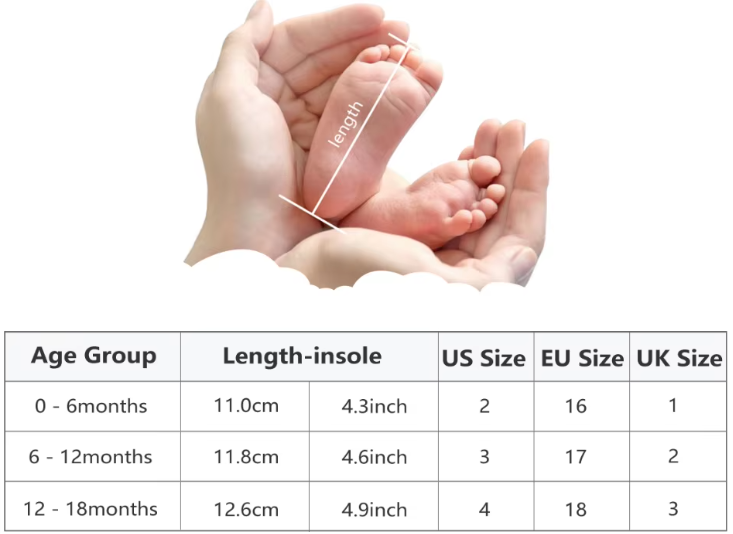 Poznámka: K délce nožičky se doporučuje připočíst tzv. nadměrek 1-1,5 cm. Doporučujeme stélku změřit nebo vzít o číslo větší, než běžně potomek nosí. Ideálně vyndat vložku z bot, a tu přeměřit. Nebo můžete nožičku přiložit k rovné zdi, změřit po paleček a k této délce připočíst 1-1,5 cm. Čínské velikosti jsou o něco menší než v Evropě.