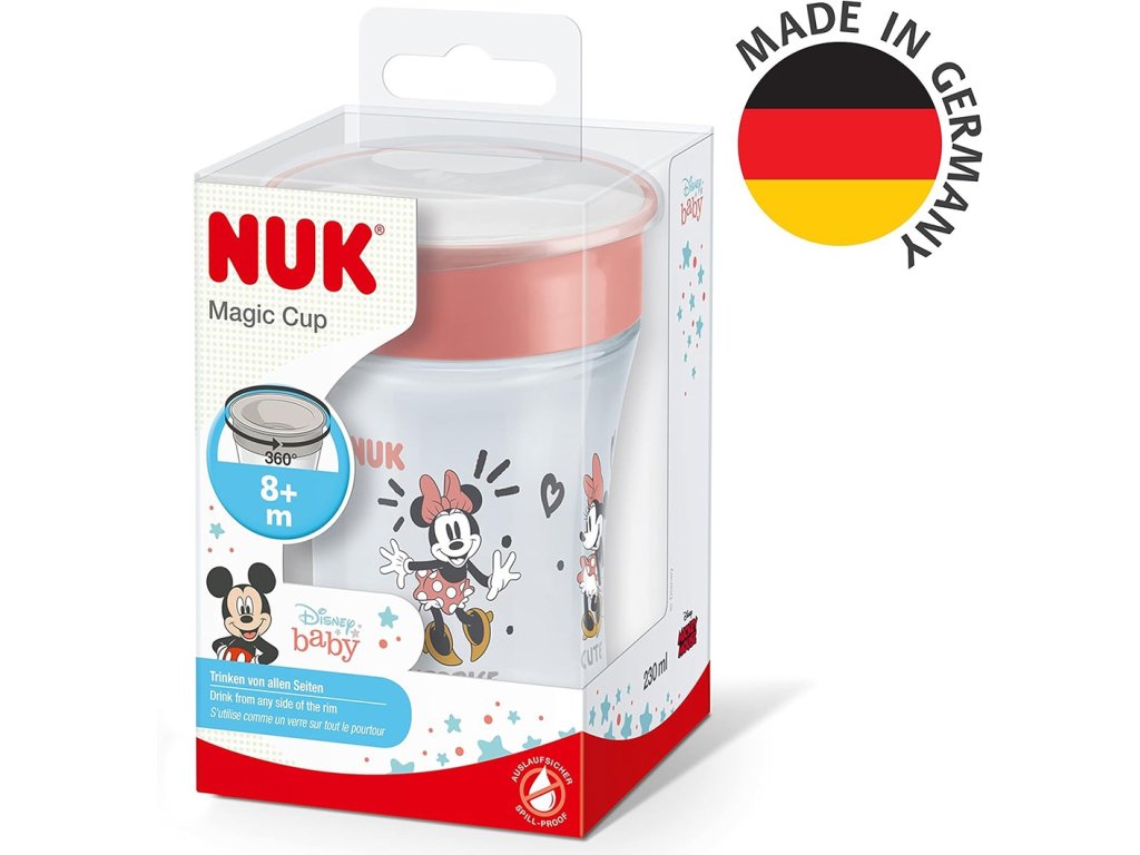 Dětský hrníček Magic NUK Minnie 360° s víčkem. Revoluční uzávěr umožňuje pít bez náustku či brčka z každé strany, díky čemuž se dítě učí samo pít jako z normálního hrníčku. Hrneček NUK Magic Cup umožňuje miminkům pít jako velké děti. 360° pitný okraj podporuje a pomáhá pít ze všech stran – žádná držátka a pití téměř jako z normálního hrnečku. Jediný „kouzelný rozdíl“ je ten, že tekutina z hrnečku nevyteče díky silikonovému disku, který utěsňuje víčko zevnitř. Nápoj začíná téct až po stlačení uzávěru dětskými ústy, takže se nemusíte bát, že se tekutina z hrníčku vylije. Ideální na cesty či výlety. Určeno pro děti od 8 měsíců. Neobsahuje BPA. Charakteristika:- pití je možné ze všech stran díky 360° pitnému okraji