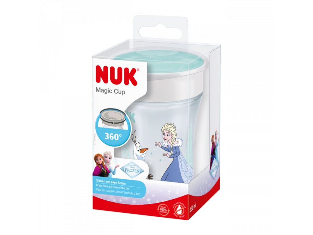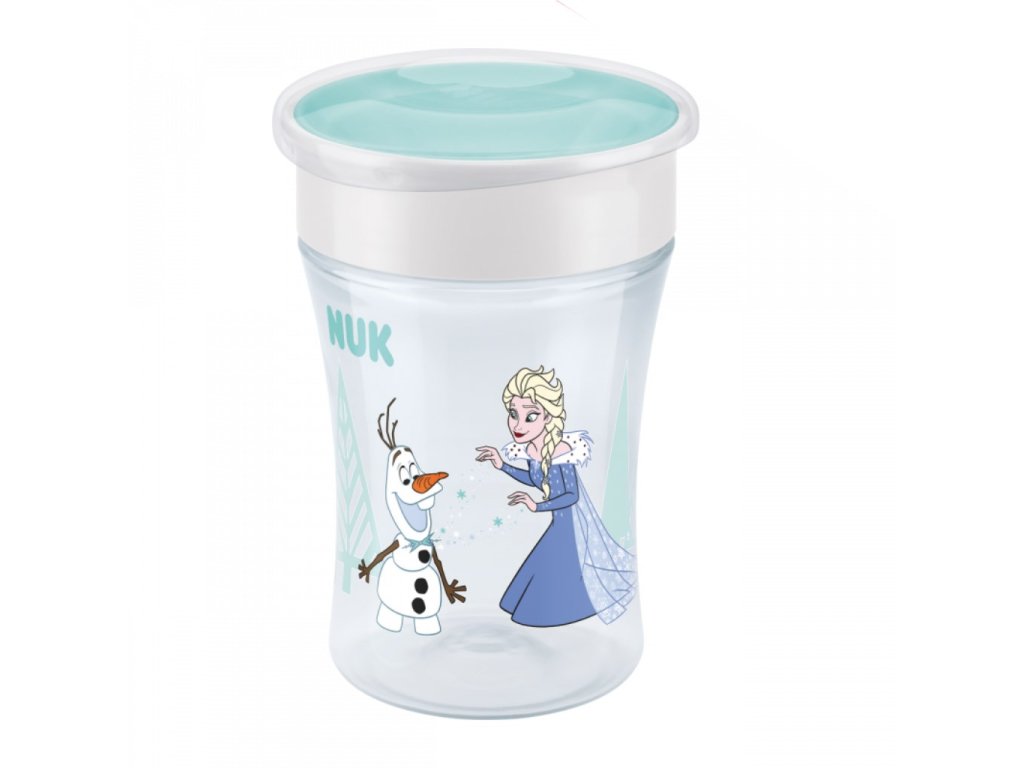 Hrneček NUK Magic Cup Frozen Elsa 230 ml umožňuje malým dětem pít jako velké děti. 360° pitný okraj podporuje a pomáhá pít ze všech stran – žádná držátka a pití téměř jako z normálního hrnečku. Jediný „kouzelný rozdíl“ je ten, že tekutina z hrnečku nevyteče díky silikonovému disku, který utěsňuje víčko zevnitř. Pití je dětská hra – stačí jednoduše sát okraj hrnečku.