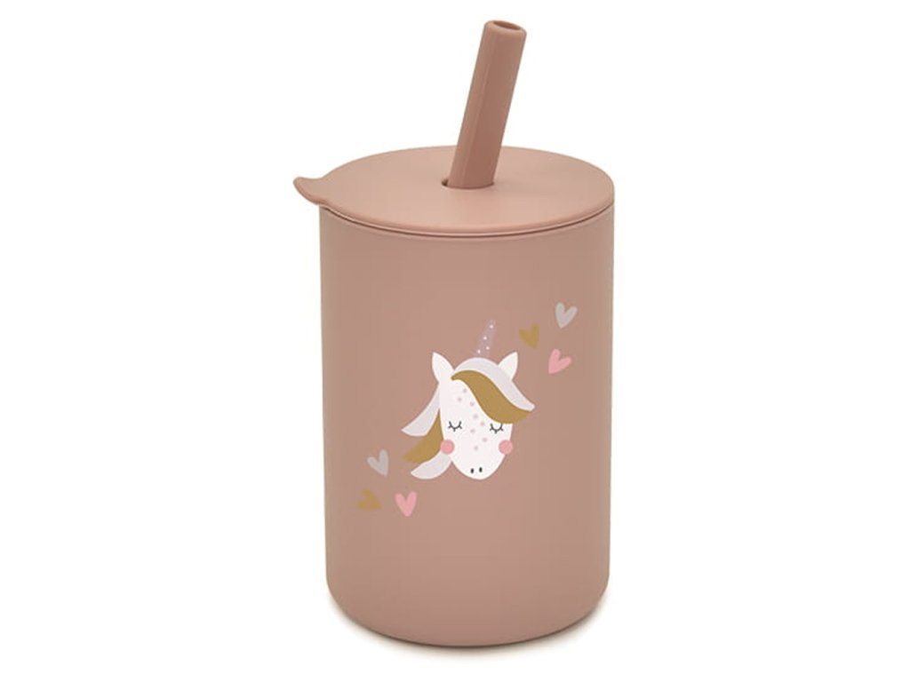 Silikonový hrnek s brčkem Jednorožec, 150 ml - pudrový