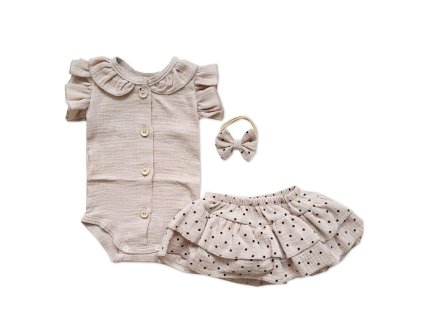 Mušelínová sukničkokraťásky, bodýčko a čelenka, 3D sada, béžová/dots