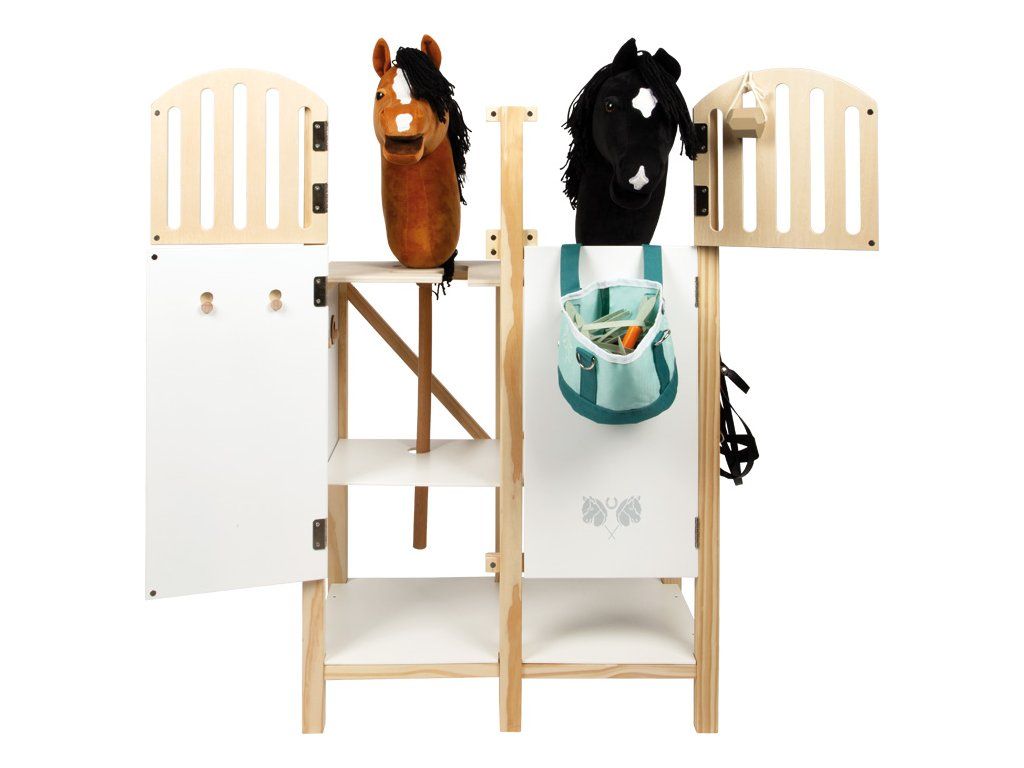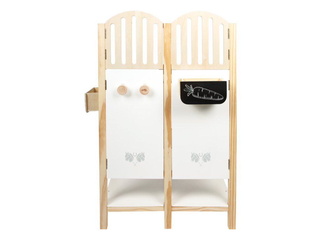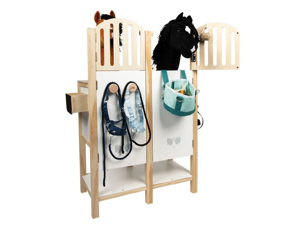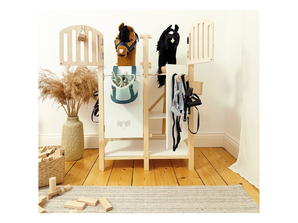 Tato detailně propracovaná stáj pro hobby koně z odolného dřeva nabízí prostor pro dva koníky a zaujme promyšlenými prvky, které přinášejí realistický zážitek ze hry. Odnímatelné krmné žlaby mají povrch vhodný pro psaní křídou, takže je lze využít i jako jmenovky boxů. Držáky na uzdu jsou variabilní – lze je umístit dopředu, na bok nebo je vyměnit s krmnými žlaby podle potřeby. Dveře i okna jsou vybaveny magnetickým zavíráním a dají se samostatně otevírat, což dodává hře na autentičnosti. Držák pro hobby koně se 2 výškovými polohami umožňuje, aby koník vykukoval z okna nebo stál uvnitř boxu. Spodní police poskytuje dostatek úložného prostoru pro ohlávky, potřeby na péči nebo pamlsky, takže je vše přehledně uložené a po ruce. S touto stájí se dětský pokoj promění v malou jízdárnu. Podporuje kreativní hraní rolí zaměřené na péči o koně, ježdění i každodenní život ve stáji.